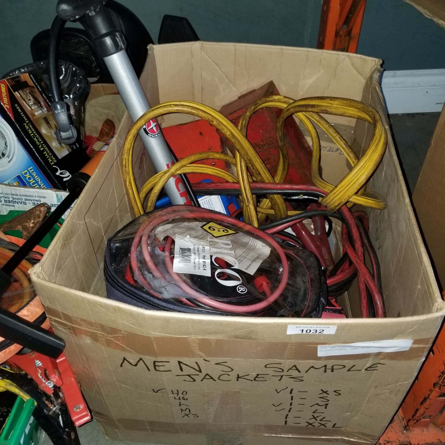 BOX OF JUMPER CABLES, REFLECTORS, AND BIKE PUMP