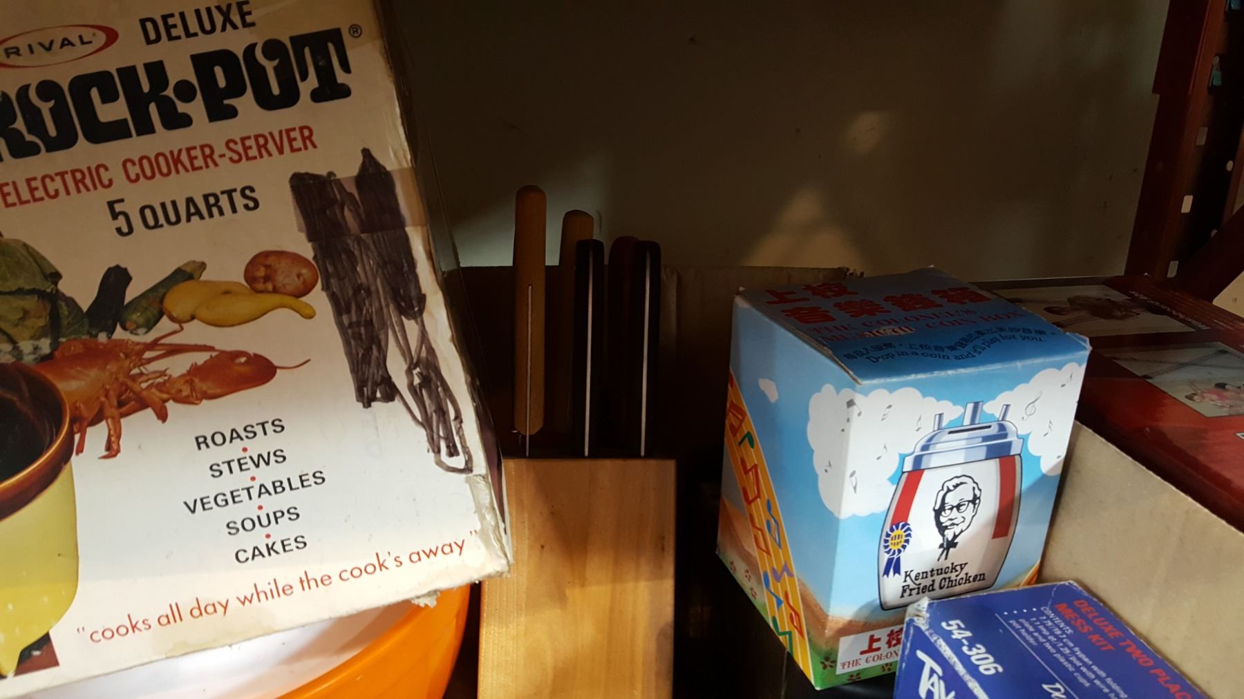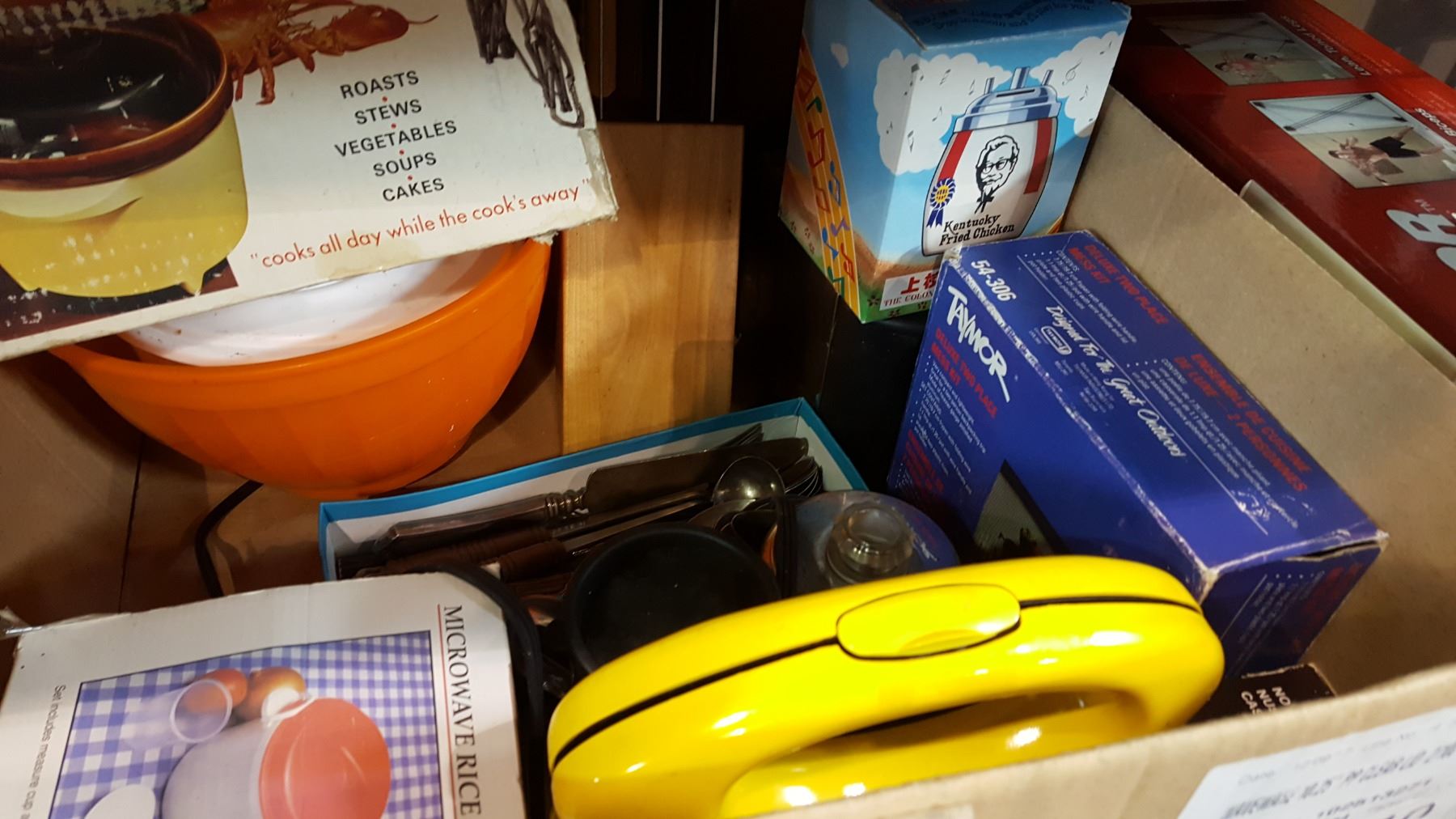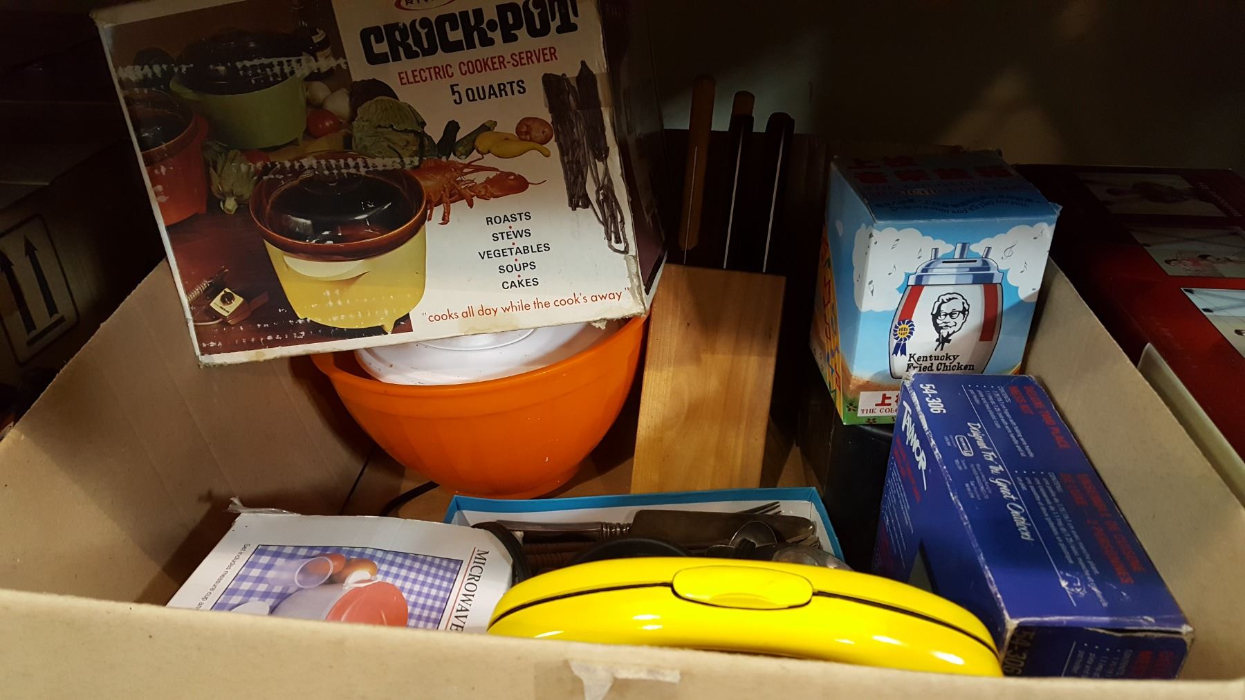 BOX OF KITCHEN ITEMS AND CROCK POT