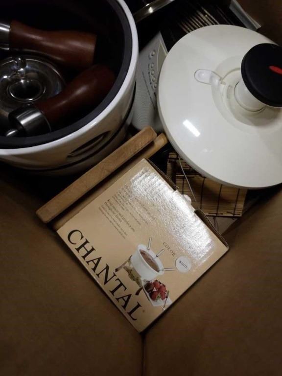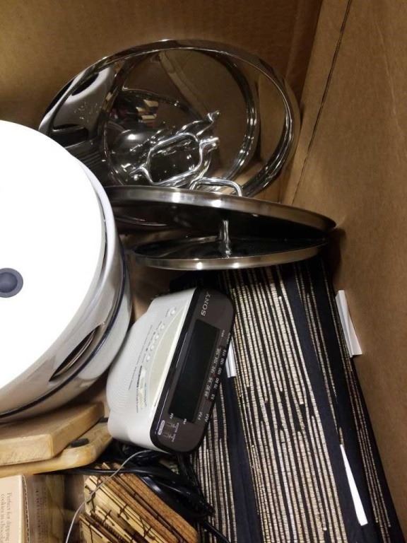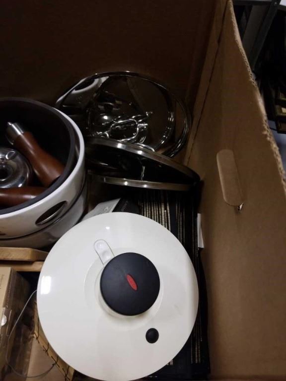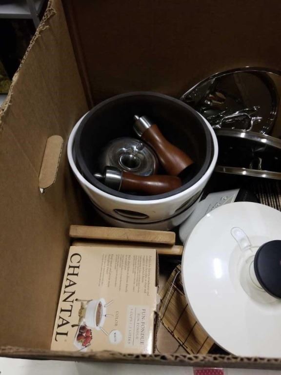 BOX OF KITCHEN ITEMS - DECORATIVE BOWLS, SALT AND PEPPER
