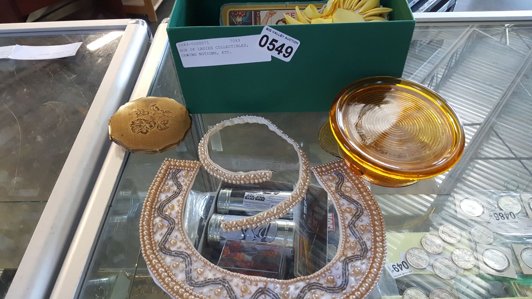 BOX OF LADIES COLLECTIBLES, SEWING NOTIONS, ETC.