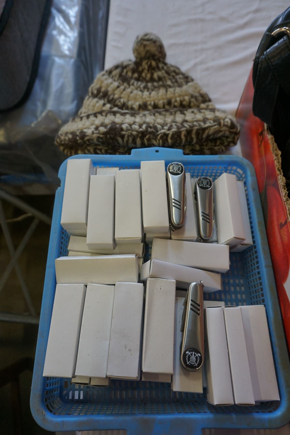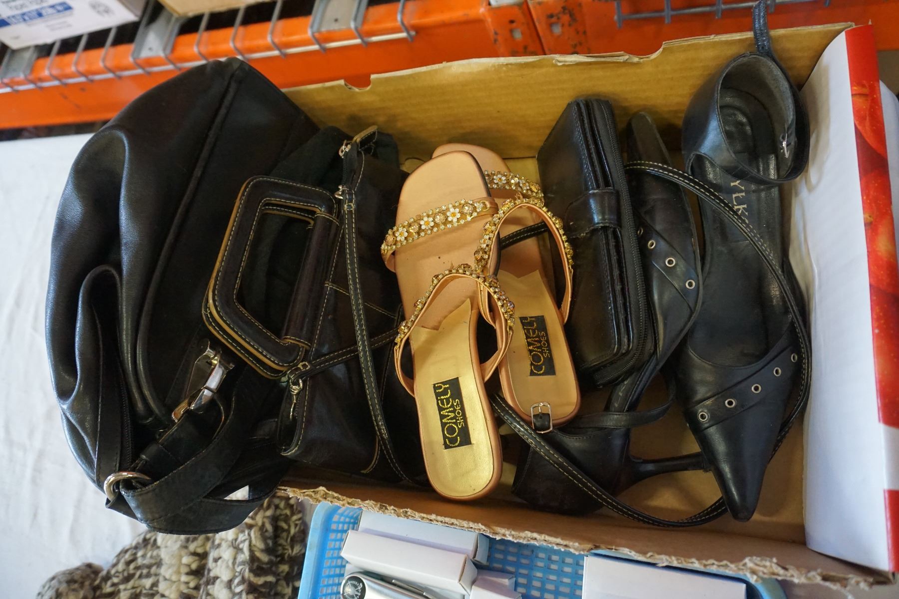 BOX OF LADY SHOES AND PURSES W/ TRAY OF MULTI TOOLS