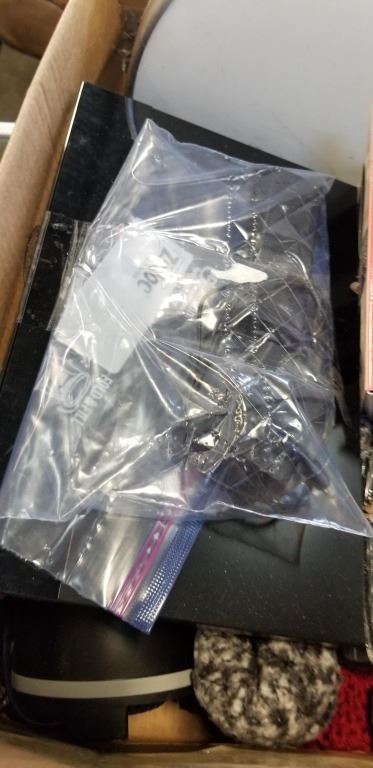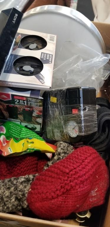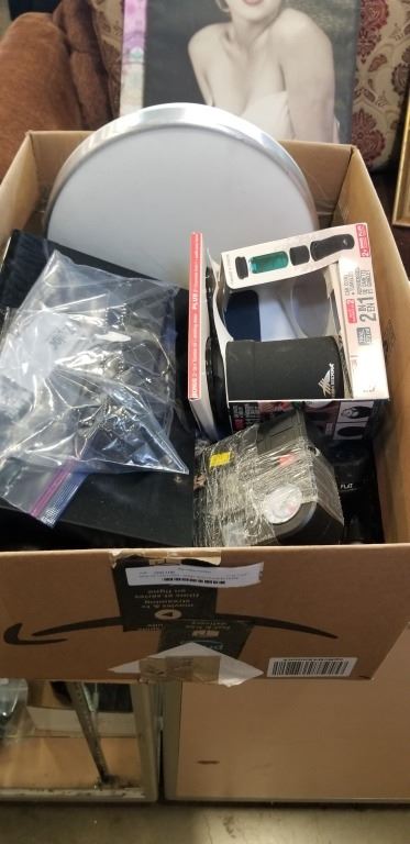 BOX OF LED LIGHT, SONY DVD PLAYER, HOSE NOZZLES, AIR COMPRESSOR AND MOWER