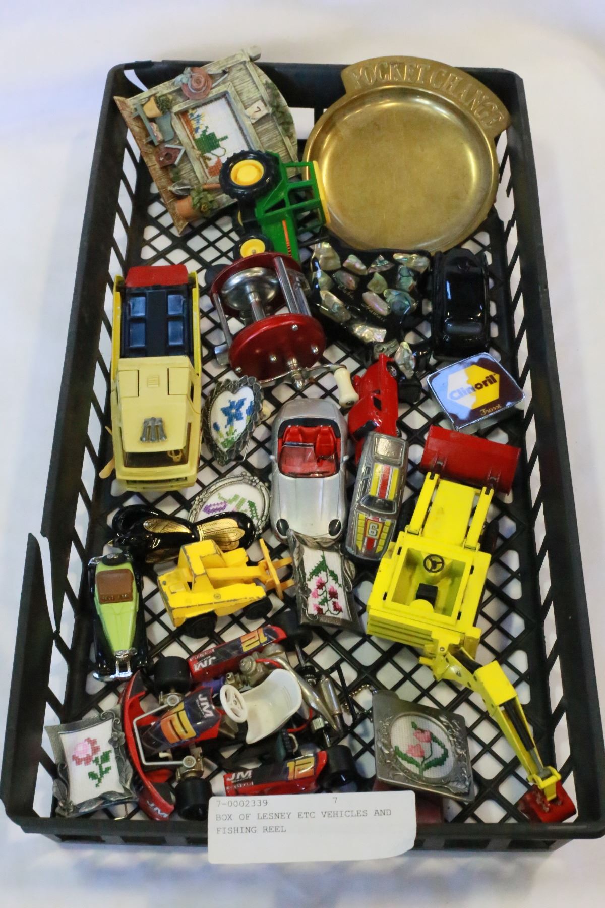 BOX OF LESNEY ETC VEHICLES AND FISHING REEL