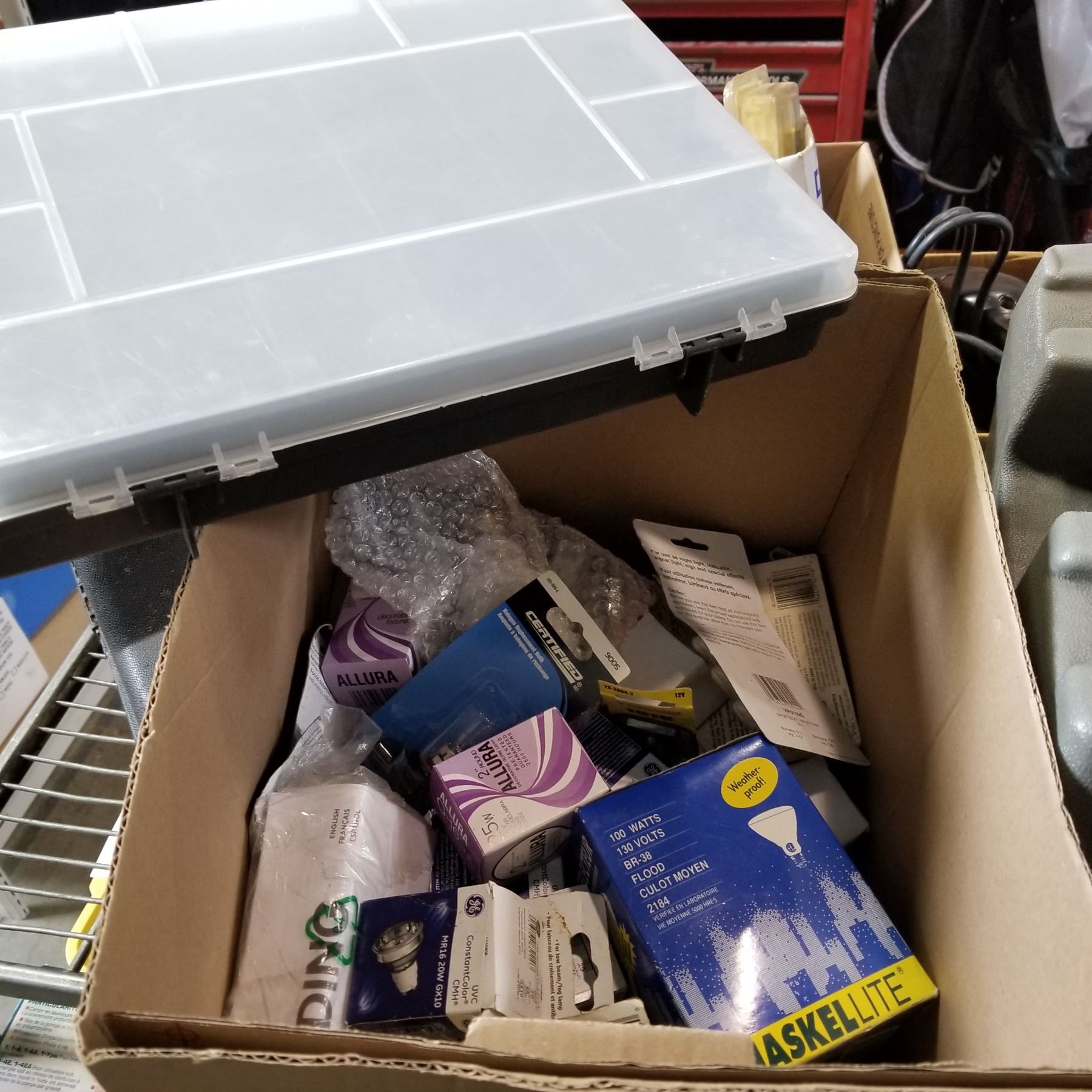 BOX OF LIGHT BULBS AND ORGANIZER
