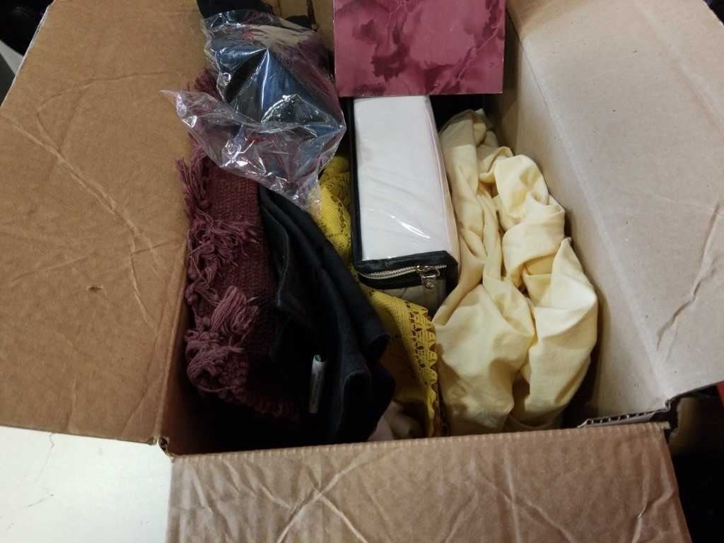 BOX OF LINENS, TWIN SHEETS, LACE, BRASS TEAPOT, LACE TABLECLOTH, BLACK PLACEMATS