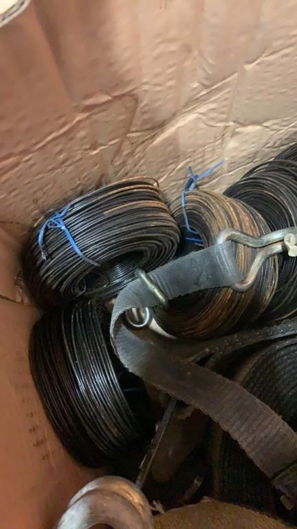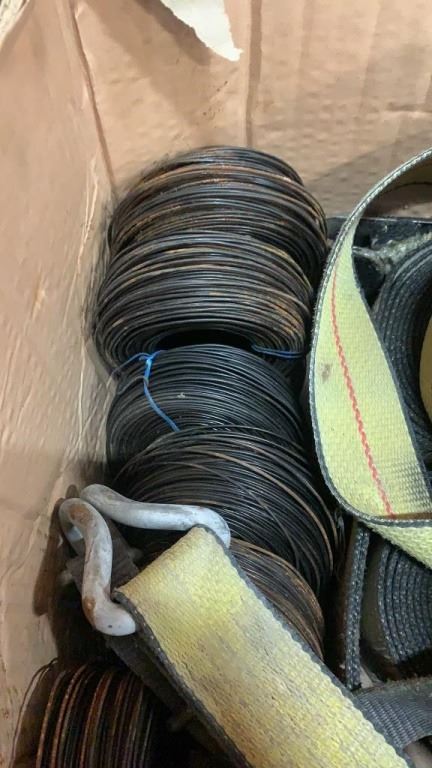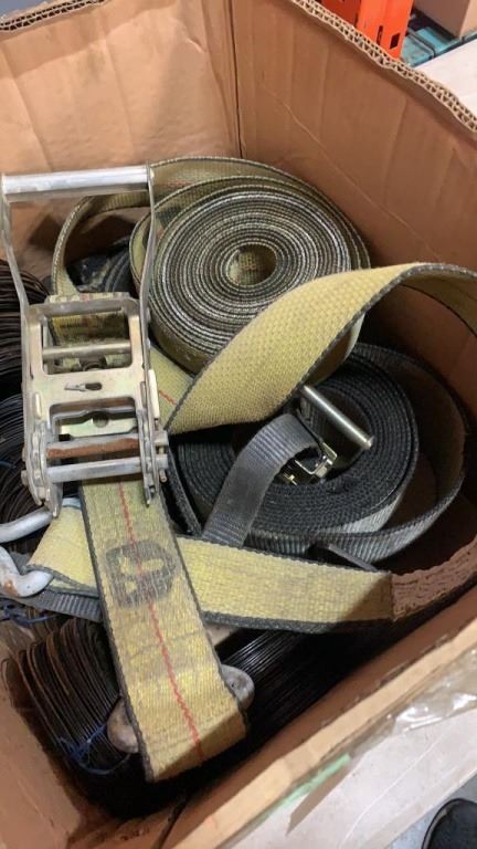 BOX OF LOAD STRAPS AND RATCHETS AND METAL WIRE