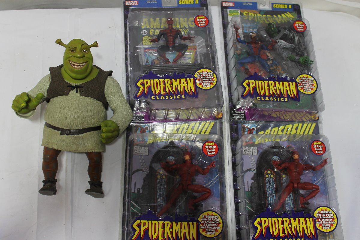 BOX OF MARVEL ACTION FIGURES AND SHREK
