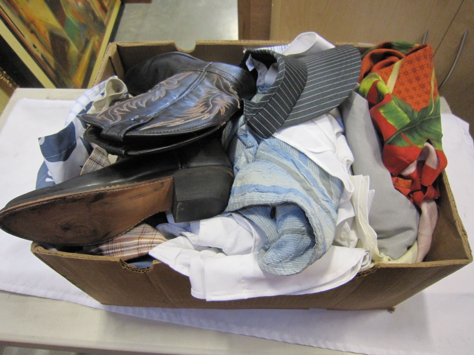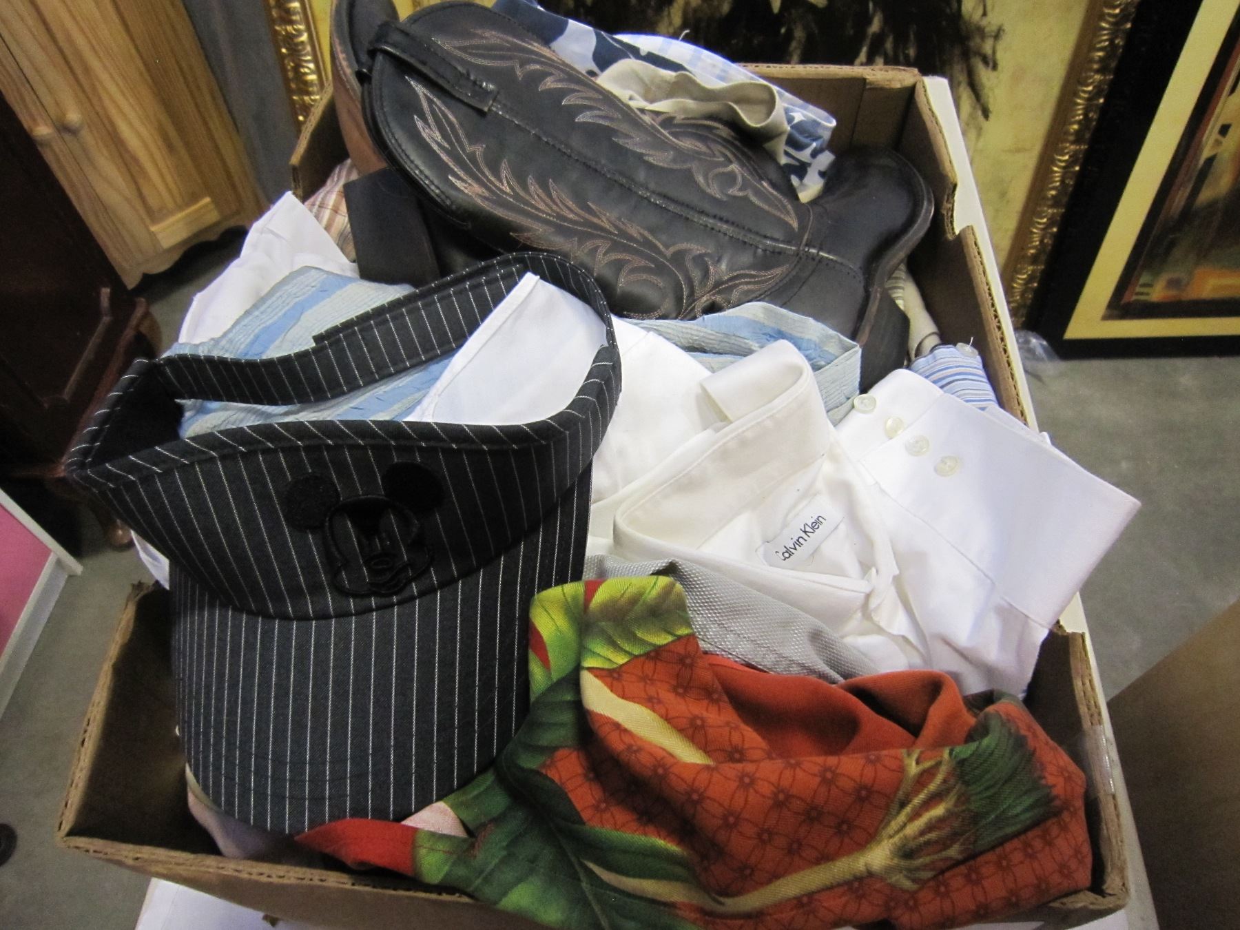 BOX OF MENS TOMMY BAHAMAS SHIRTS AND DRESS SHIRTS, AND COWBOY BOOTS