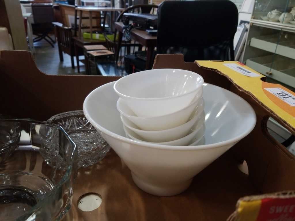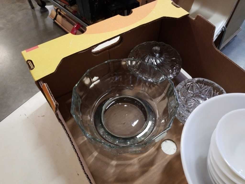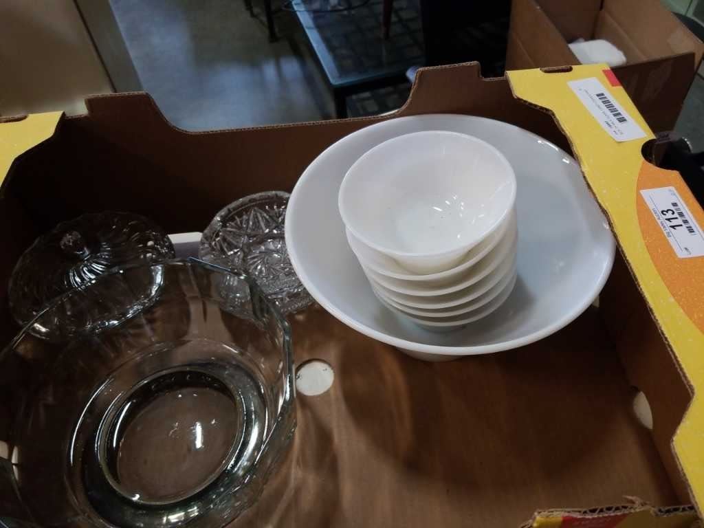 BOX OF MILK GLASS, CANDY DISHES AND ASH TRAYS