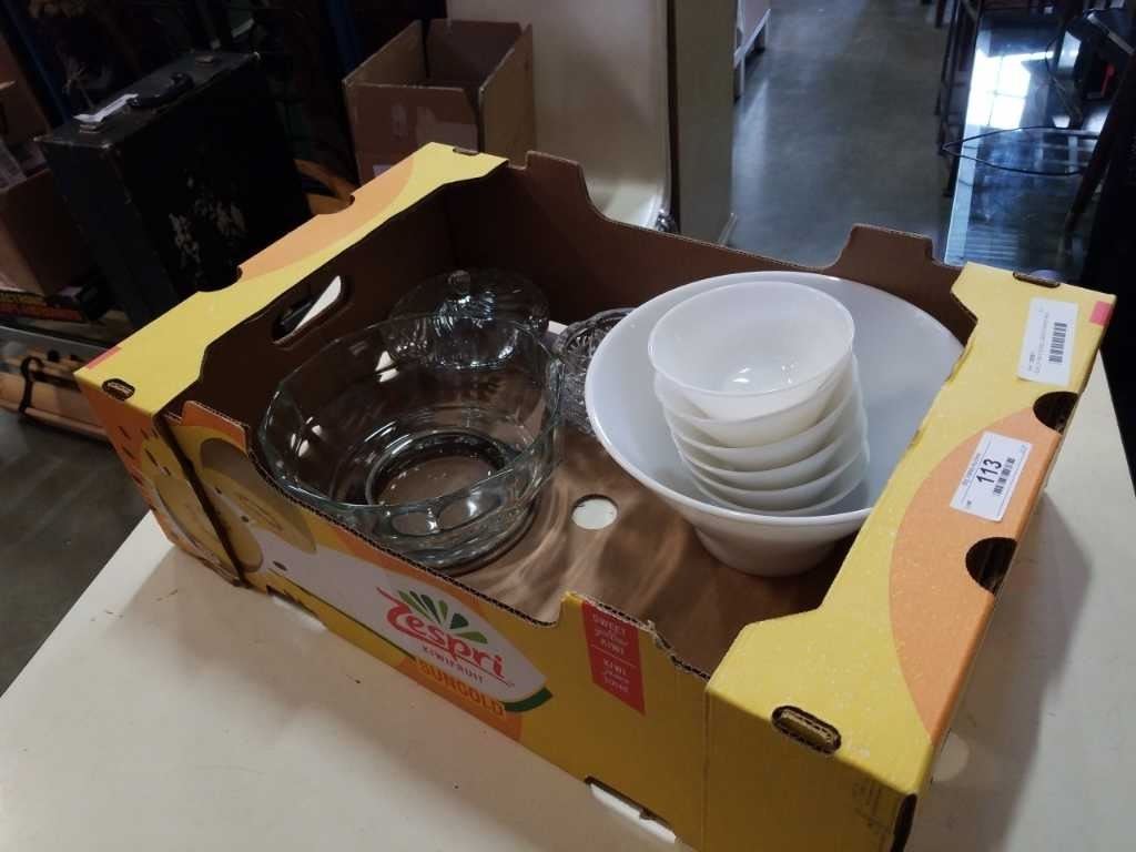 BOX OF MILK GLASS, CANDY DISHES AND ASH TRAYS