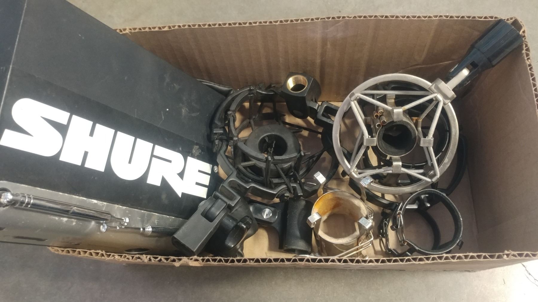 BOX OF MISC HOLDERS AND SHURE VHF RECIEVER