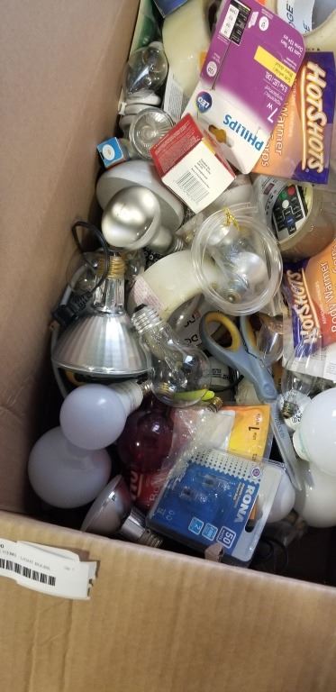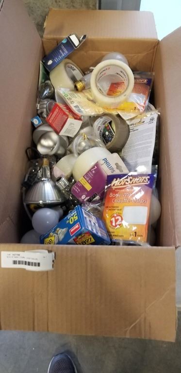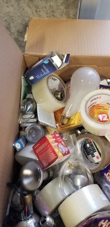 BOX OF MISC ITEMS - LIGHT BULBS, PACKING TAPE, TOOLS, ETC
