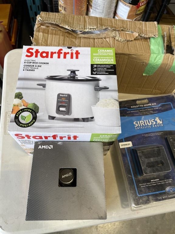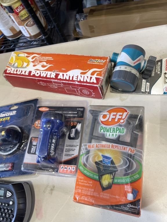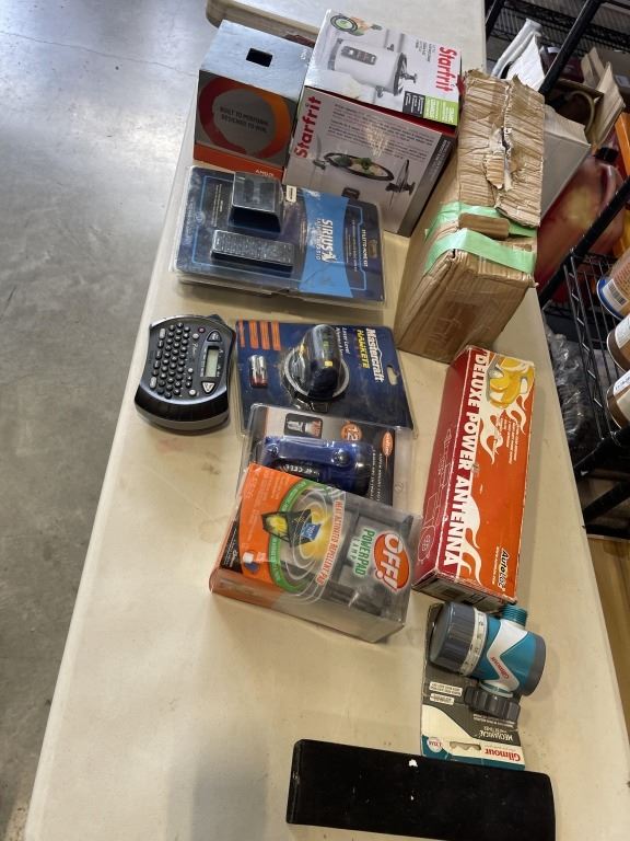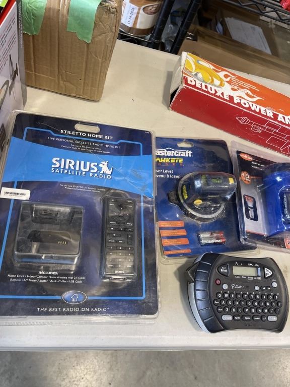 BOX OF MISC ITEMS, MOSLY NEW - VANITY LIGHT, MASTERCRAFT LASER LEVEL, SIRIUS RADIO KIT, ETC