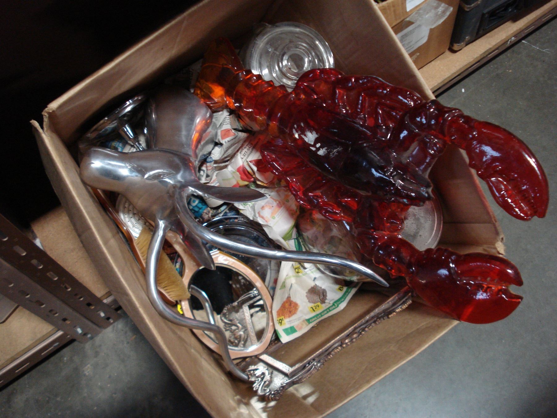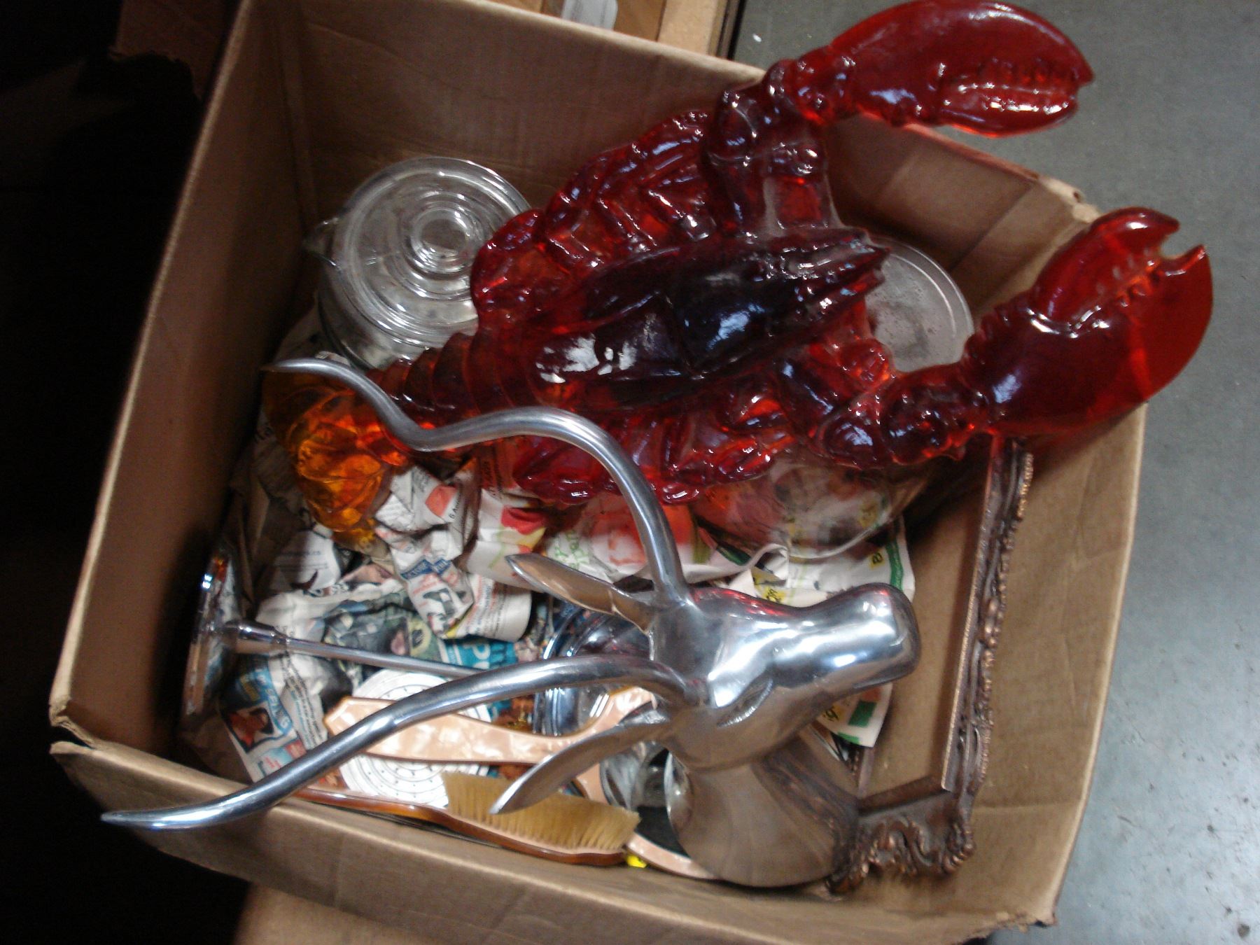 BOX OF MISC VINTAGE ITEMS GLASS LOBSTER, METAL DEER
