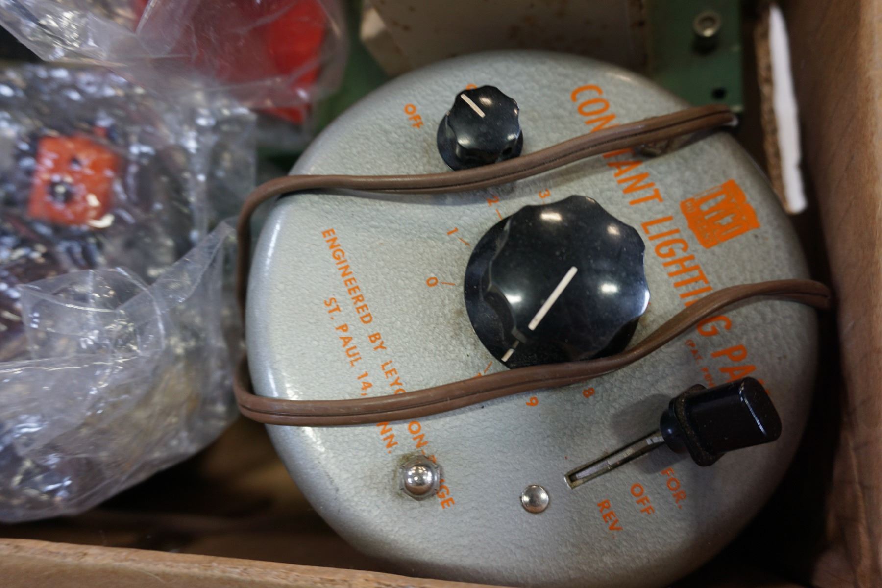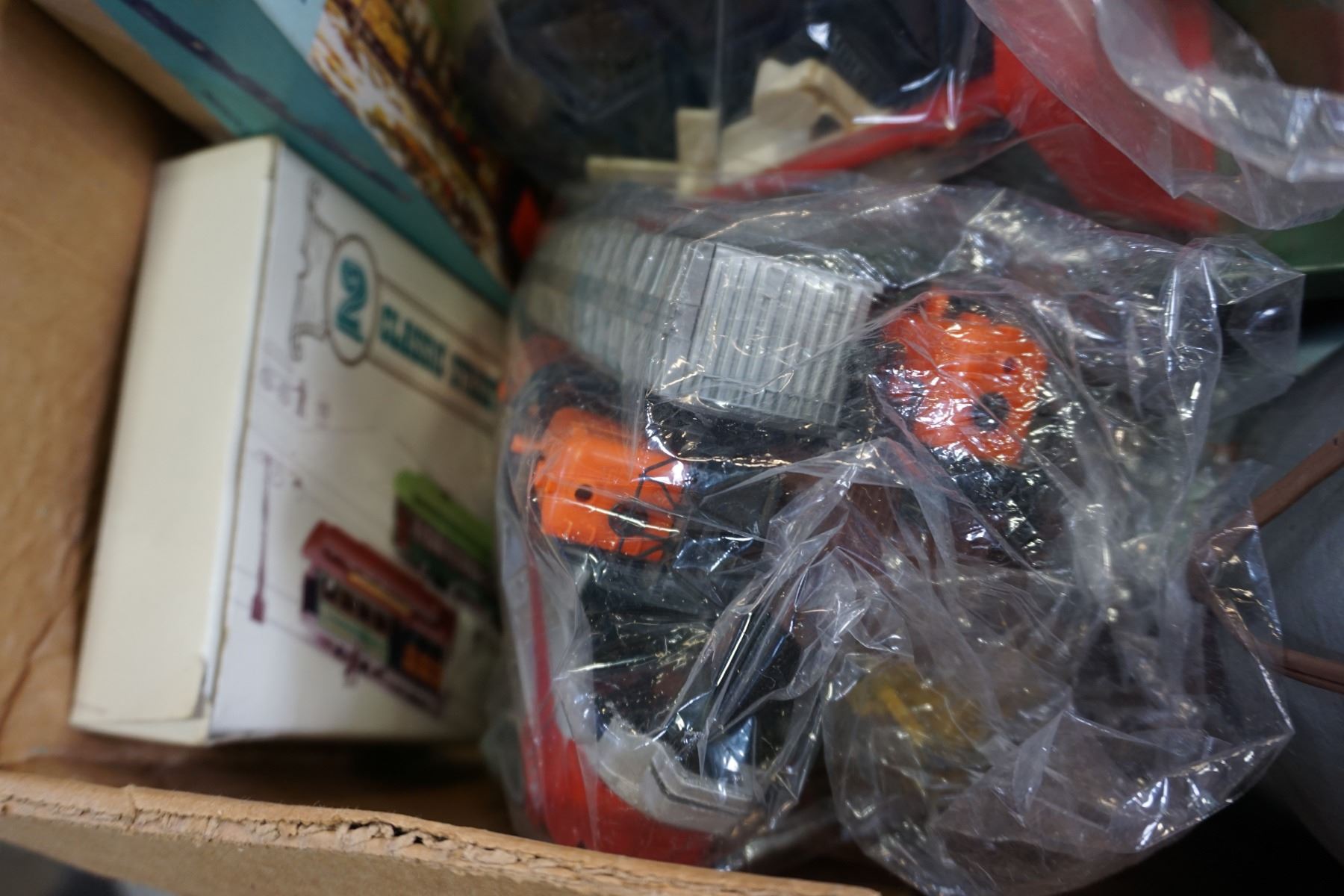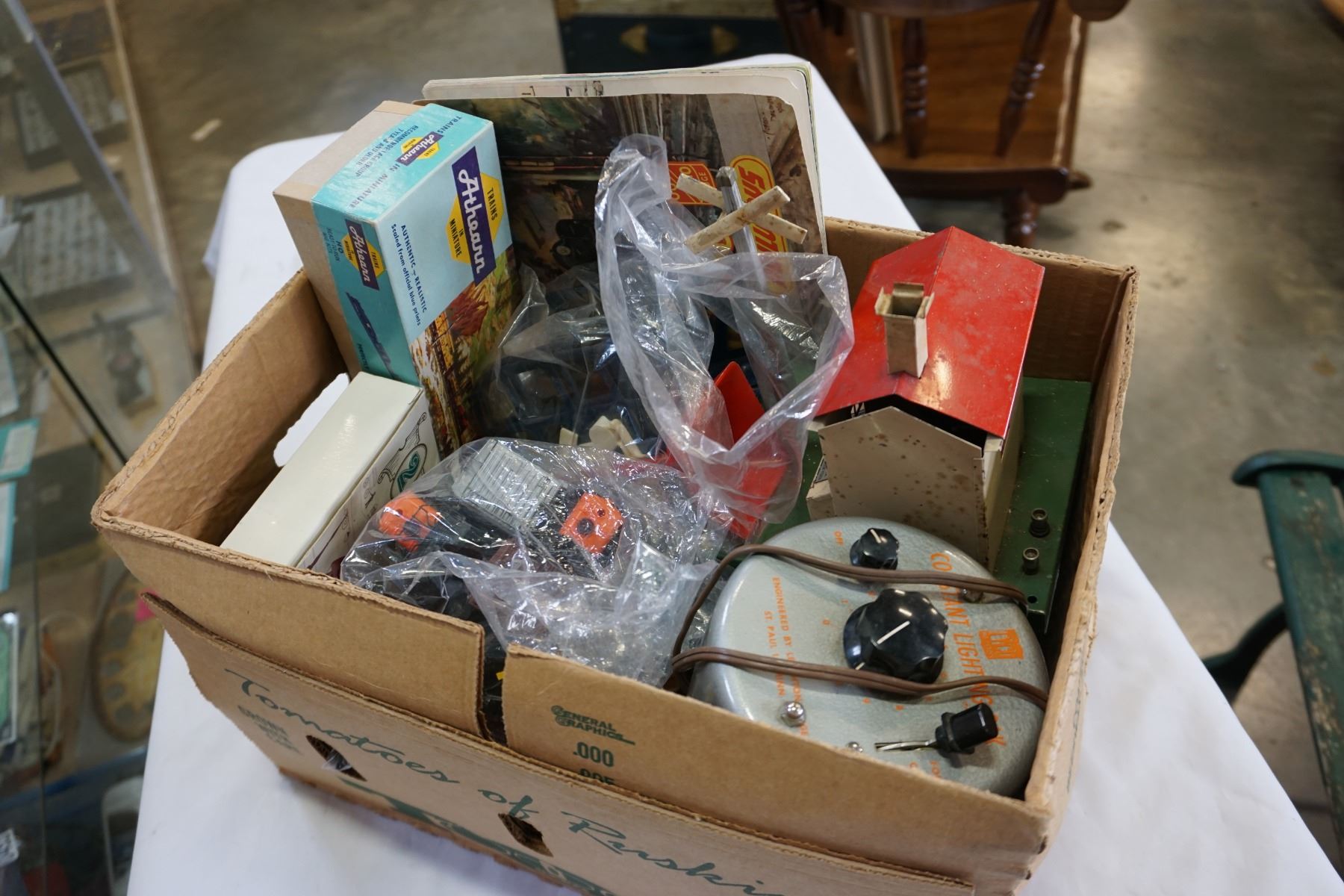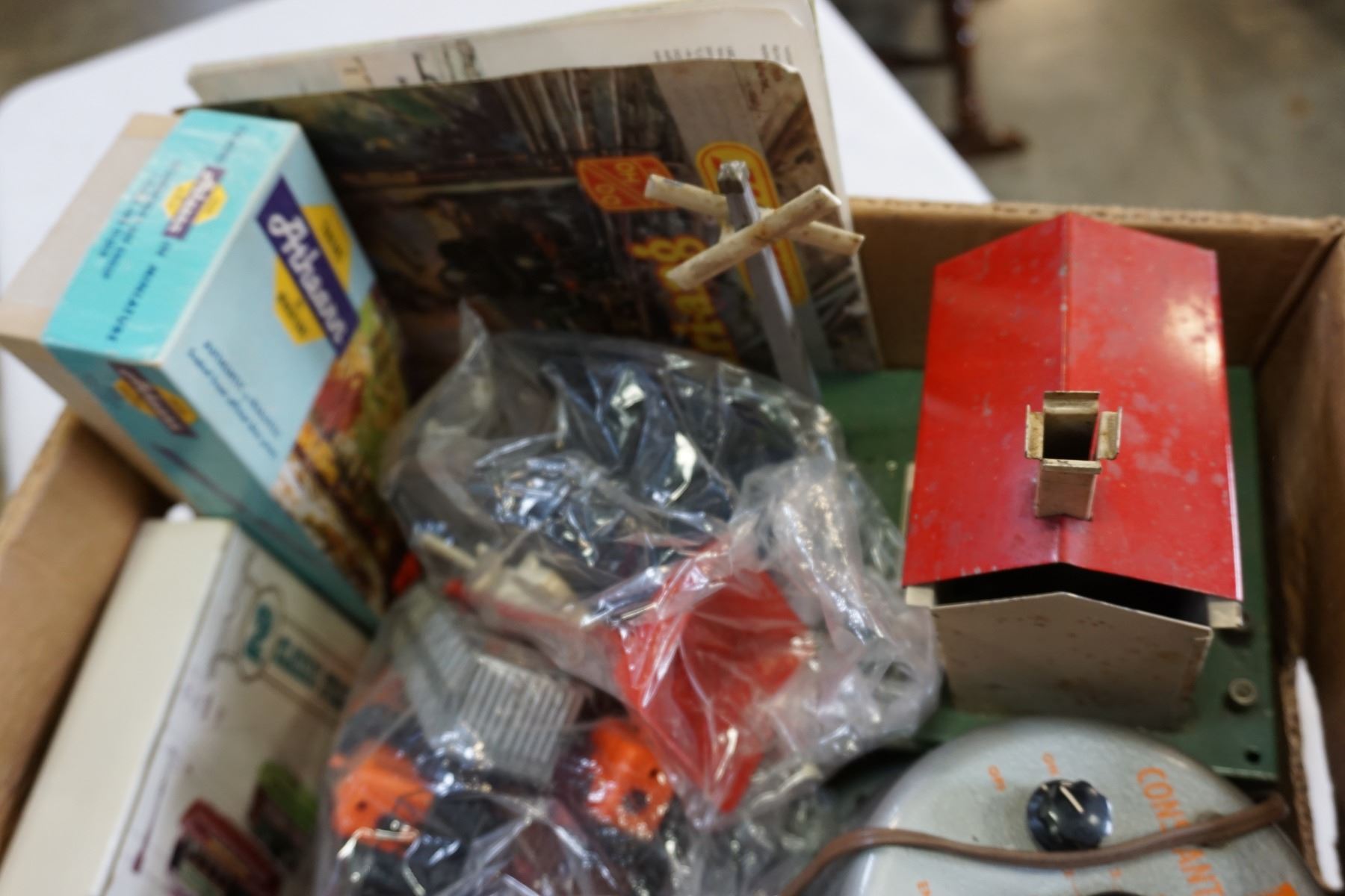 BOX OF MODEL TRAIN CARS, SET PIECES AND CONTROLLER