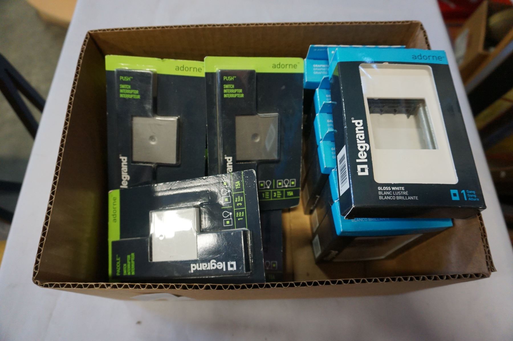 BOX OF NEW ADORNE SWITCH INTERUPTERS AND PANELS