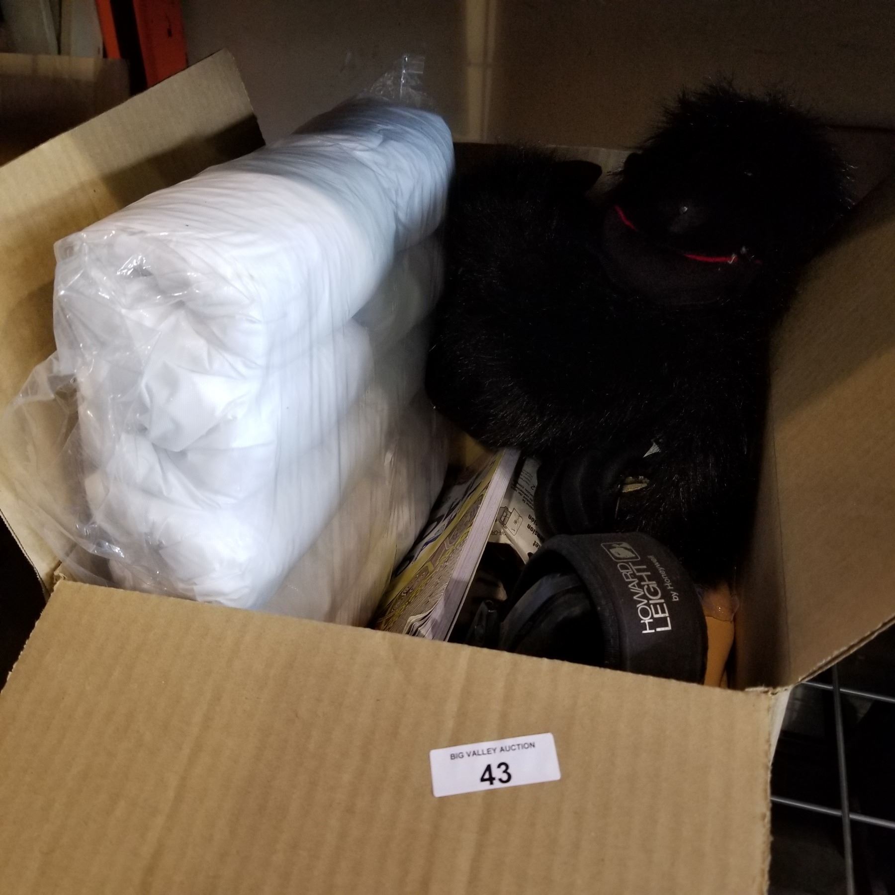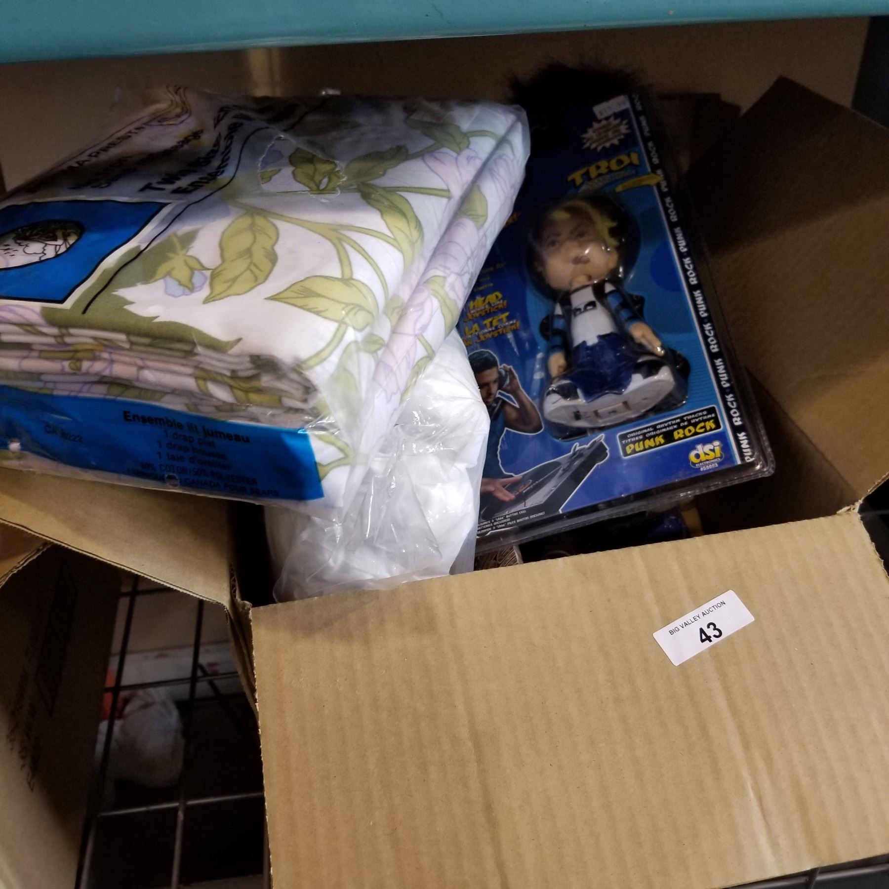 BOX OF NEW BED SHEET, BOBBLEHEAD AND MORE