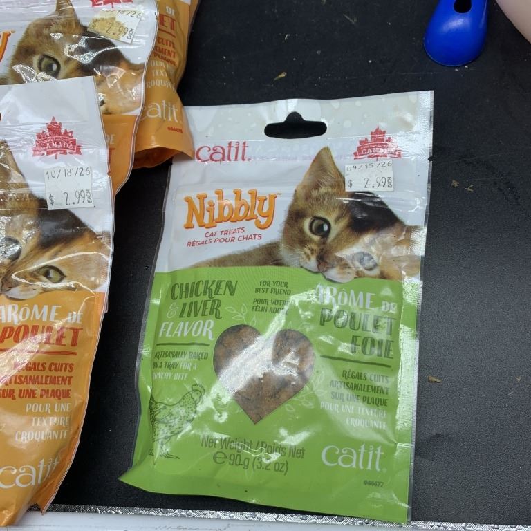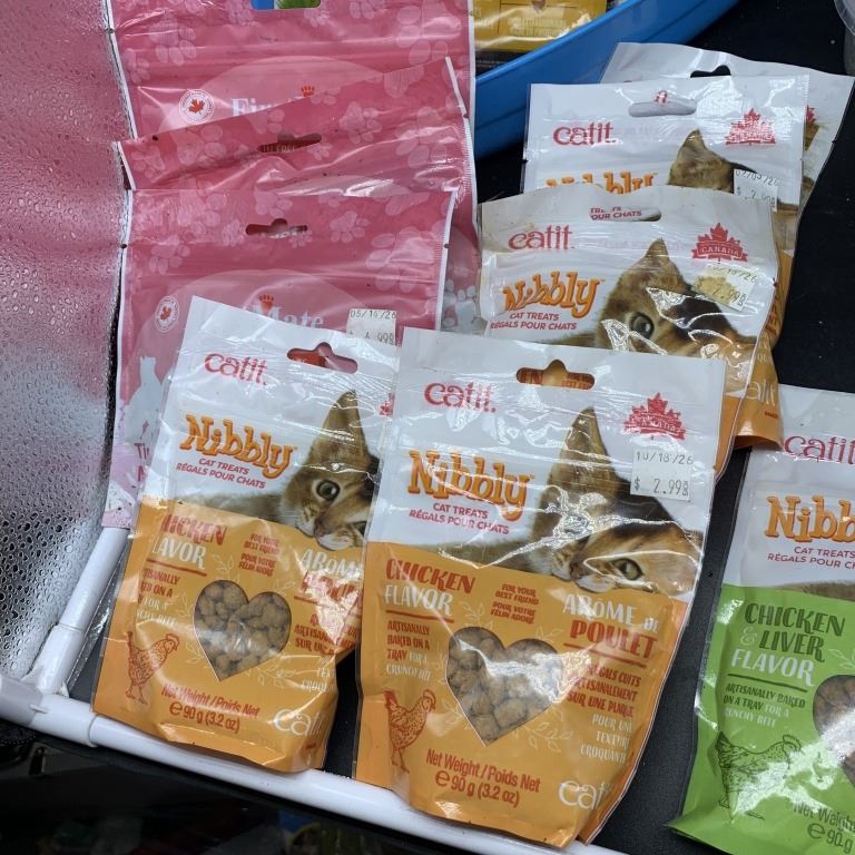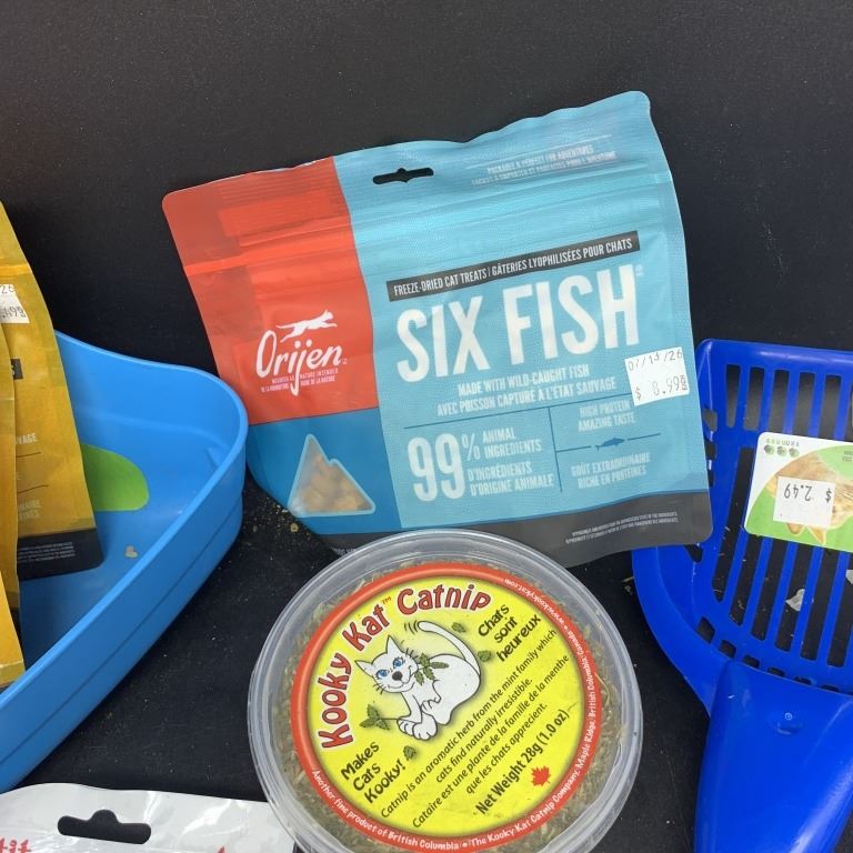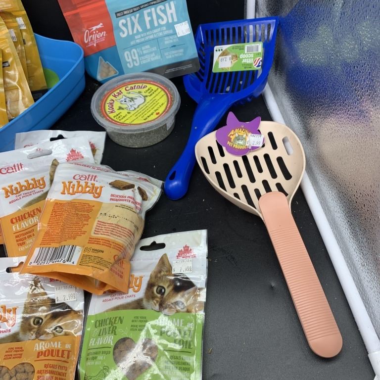 BOX OF NEW CAT FOOD, TREATS, ACCESSORIES AND CORNER LITTER BOX BEST BEFORE 2026