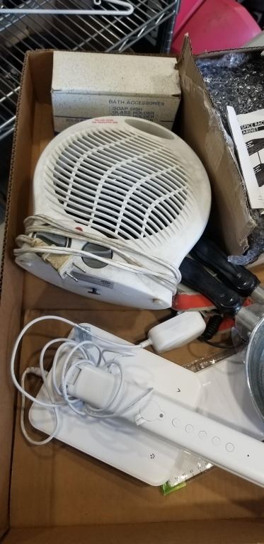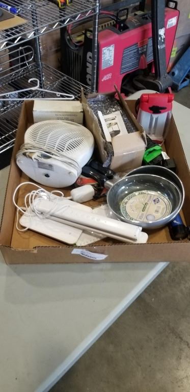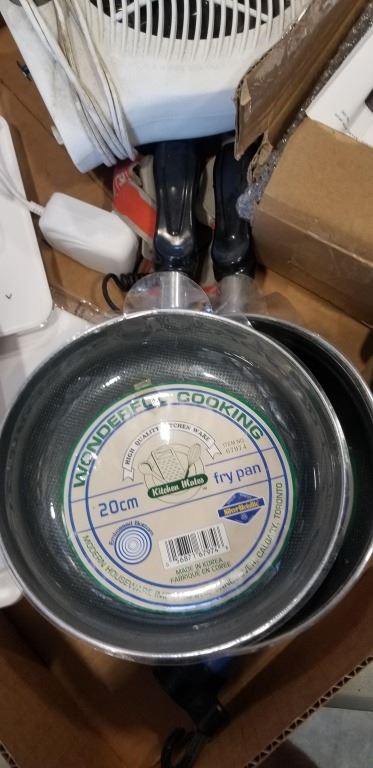 BOX OF NEW FRY PANS, SPICE RACK SHELF, FAN AND MORE