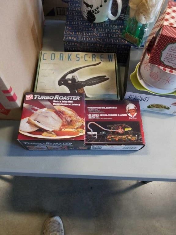 BOX OF NEW ITEMS,:TURBO ROASTER, CORKSCREW, GIFT SETS AND MORE
