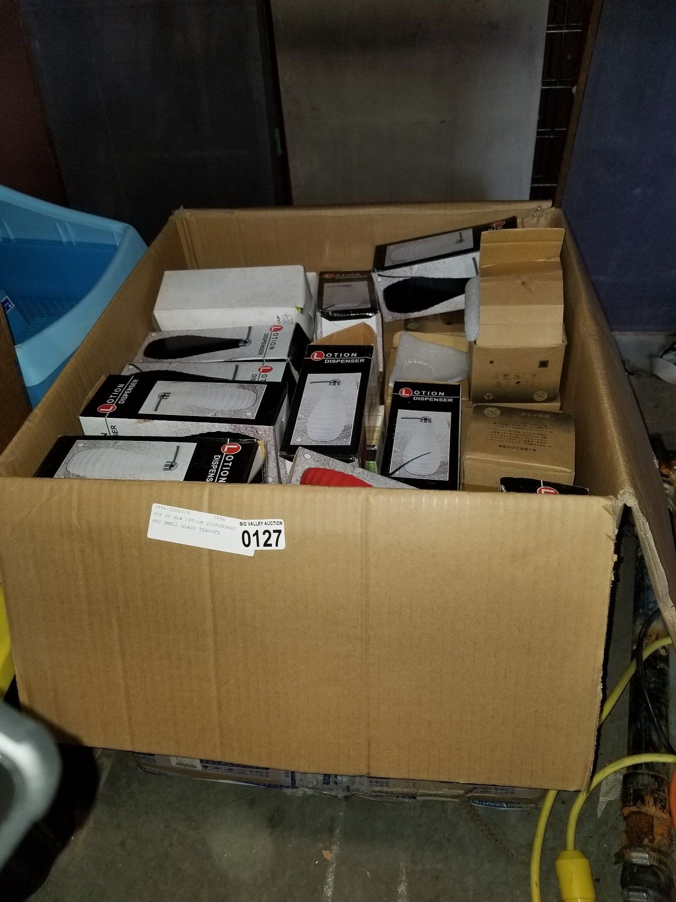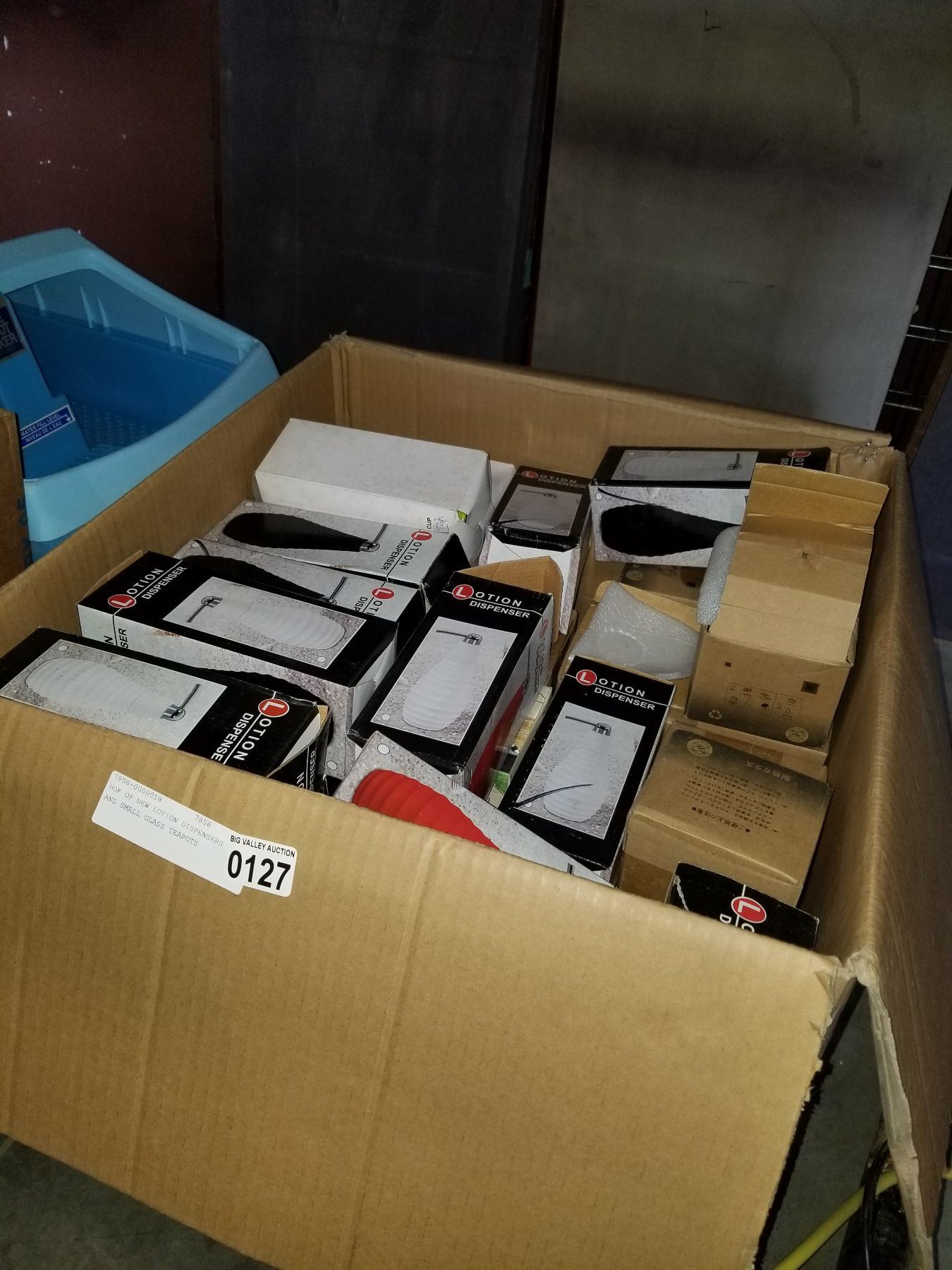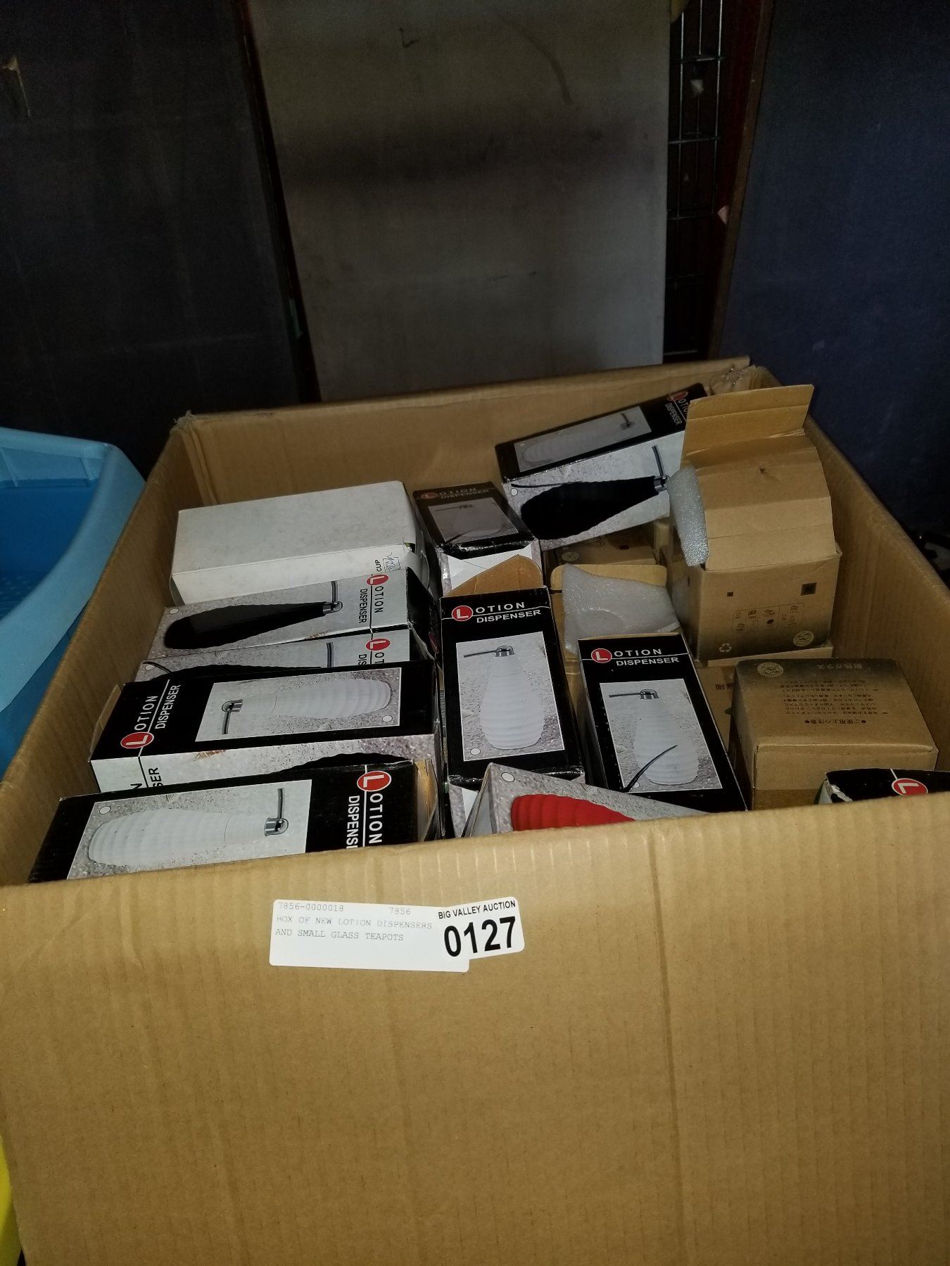 BOX OF NEW LOTION DISPENSERS AND SMALL GLASS TEAPOTS