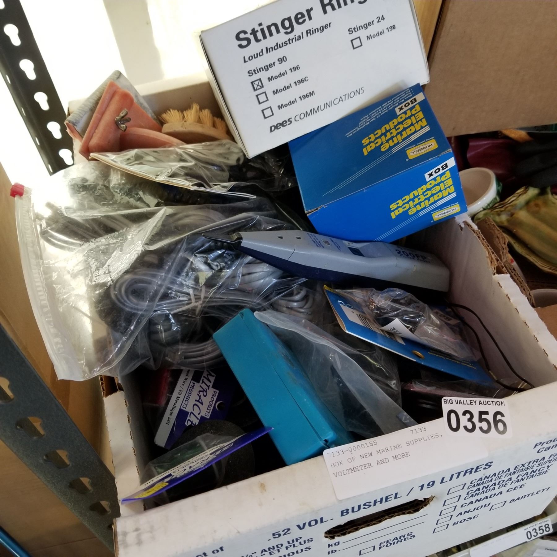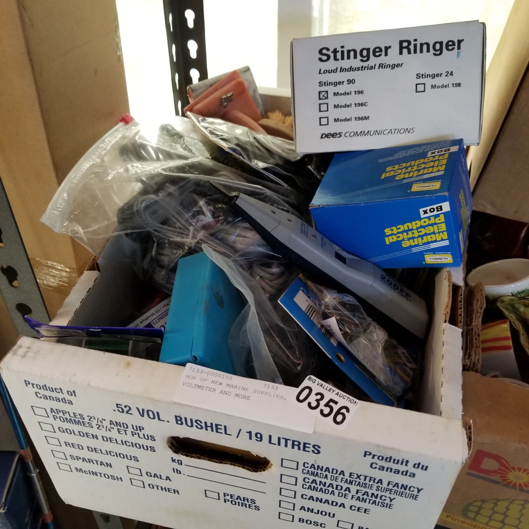 BOX OF NEW MARINE SUPPLIES, VOLTMETER AND MORE
