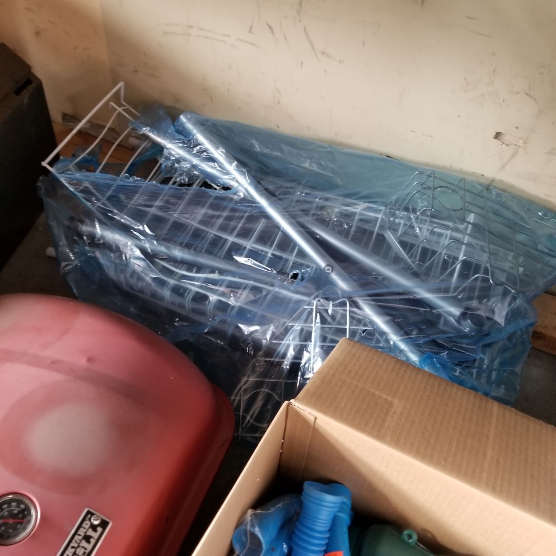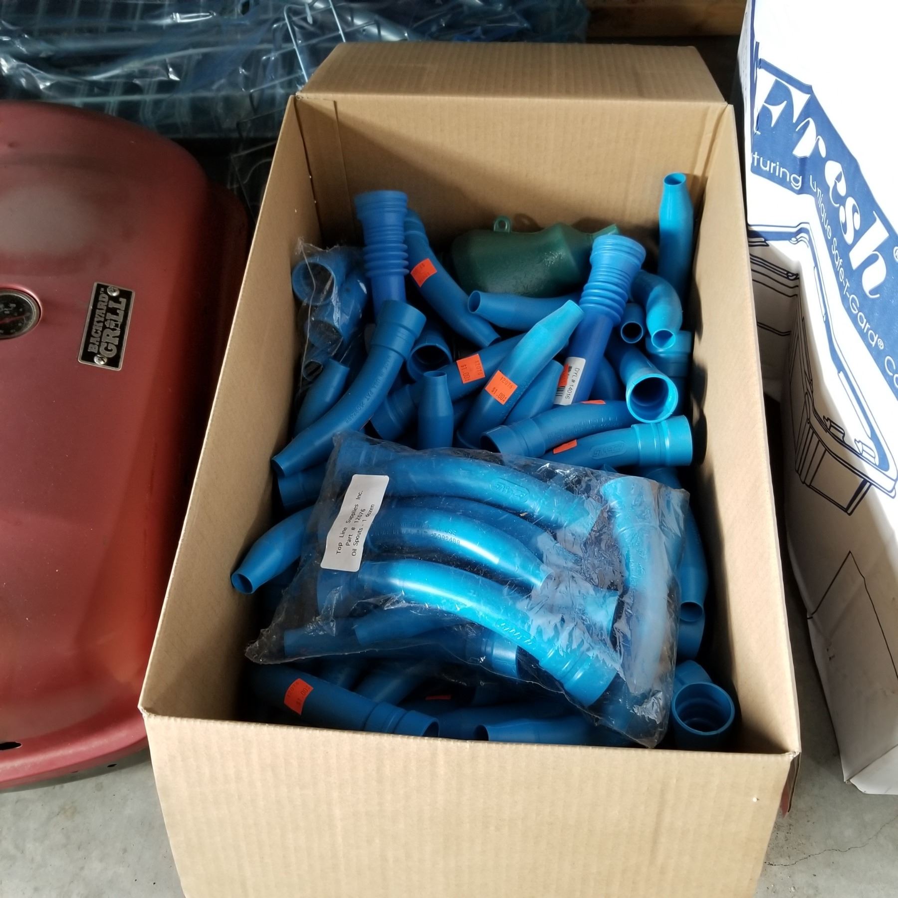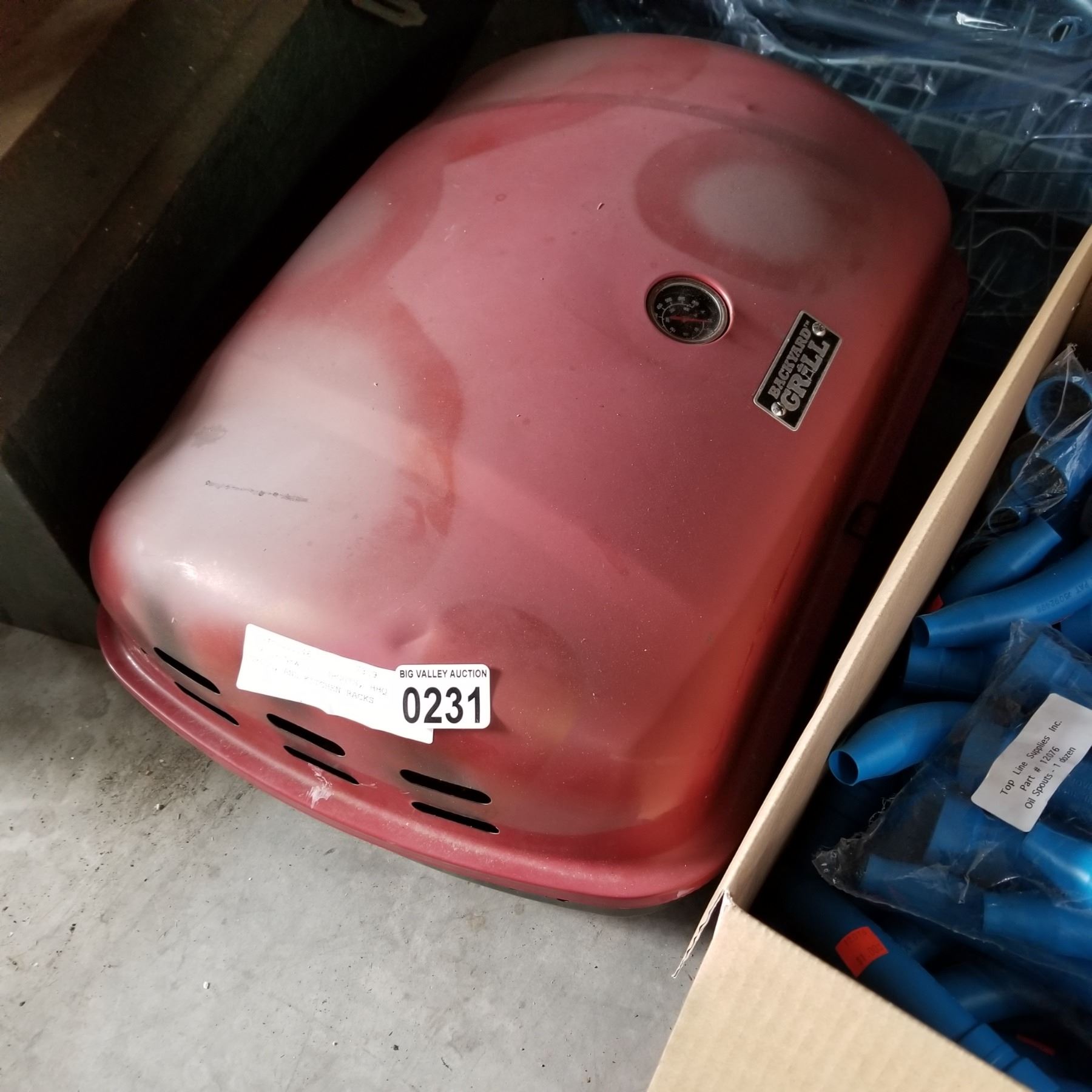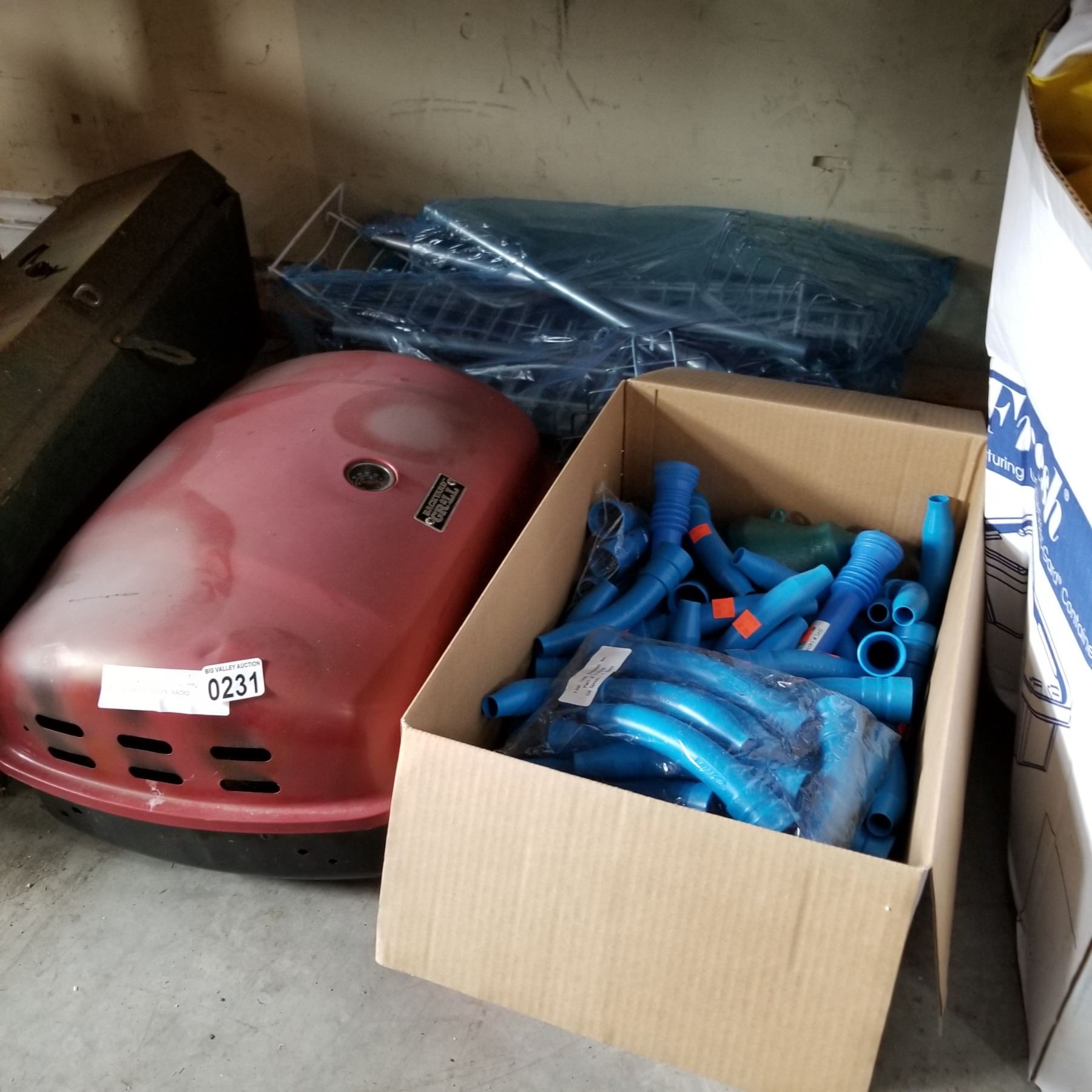 BOX OF NEW OIL SPOUTS, BBQ GRILL, AND KITCHEN RACKS