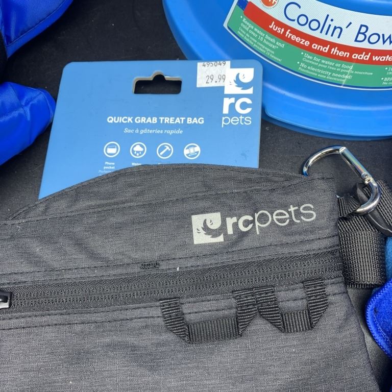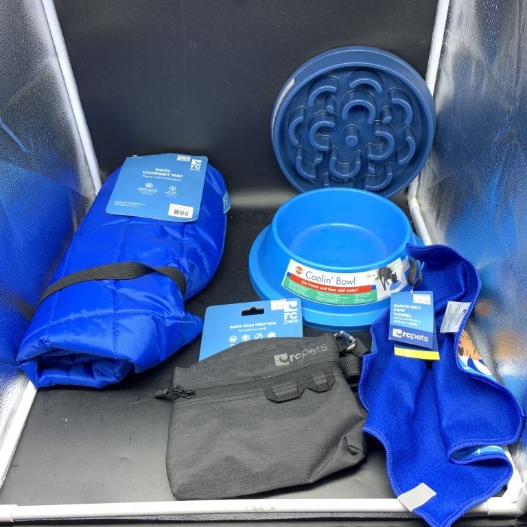 BOX OF NEW PET ACCESSORIES RC PETS QUICK DRY TOWEL, COOLIN BOWL, QUICK GRAB TREAT BAG AND MORE