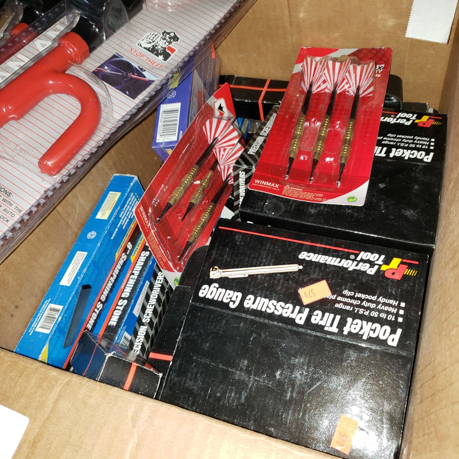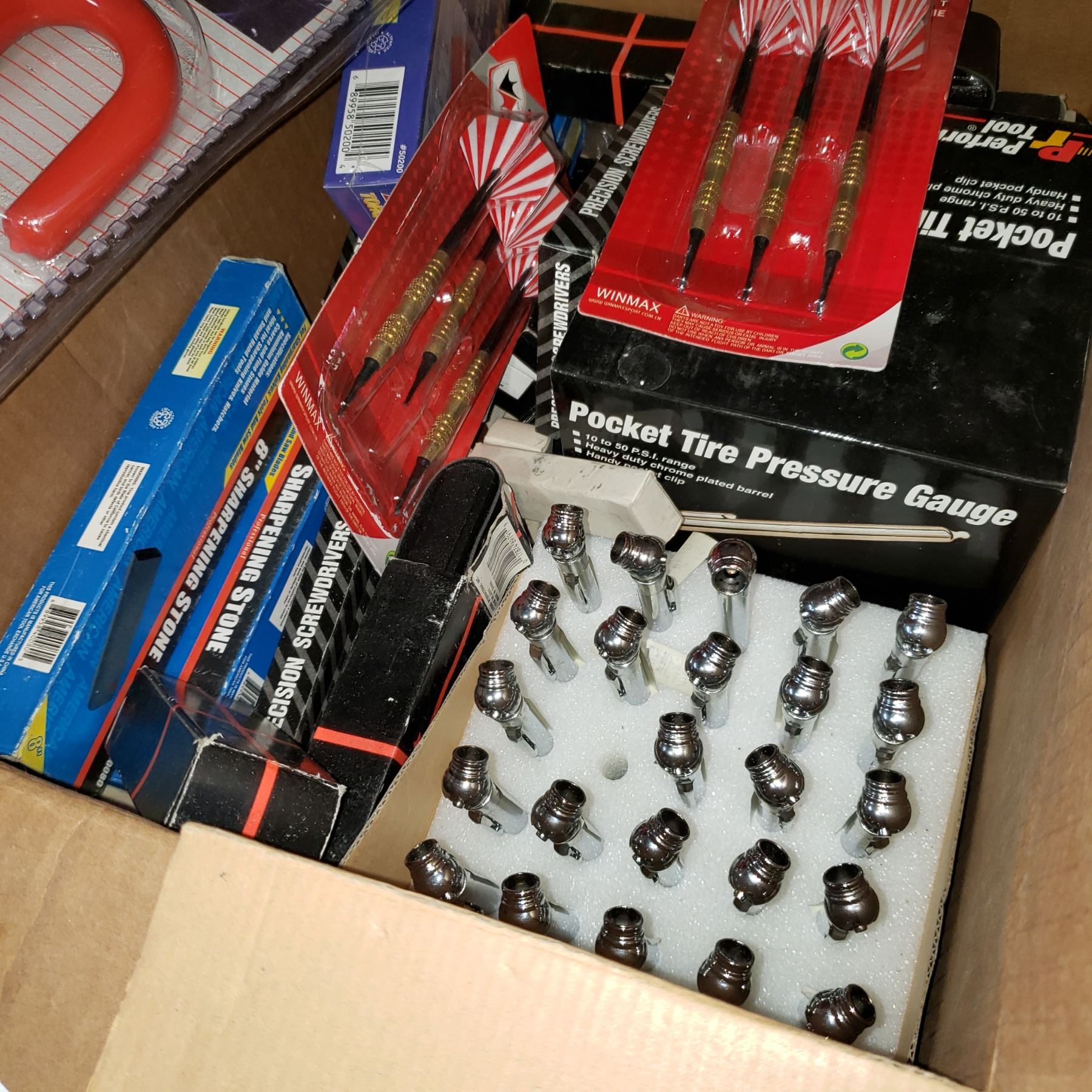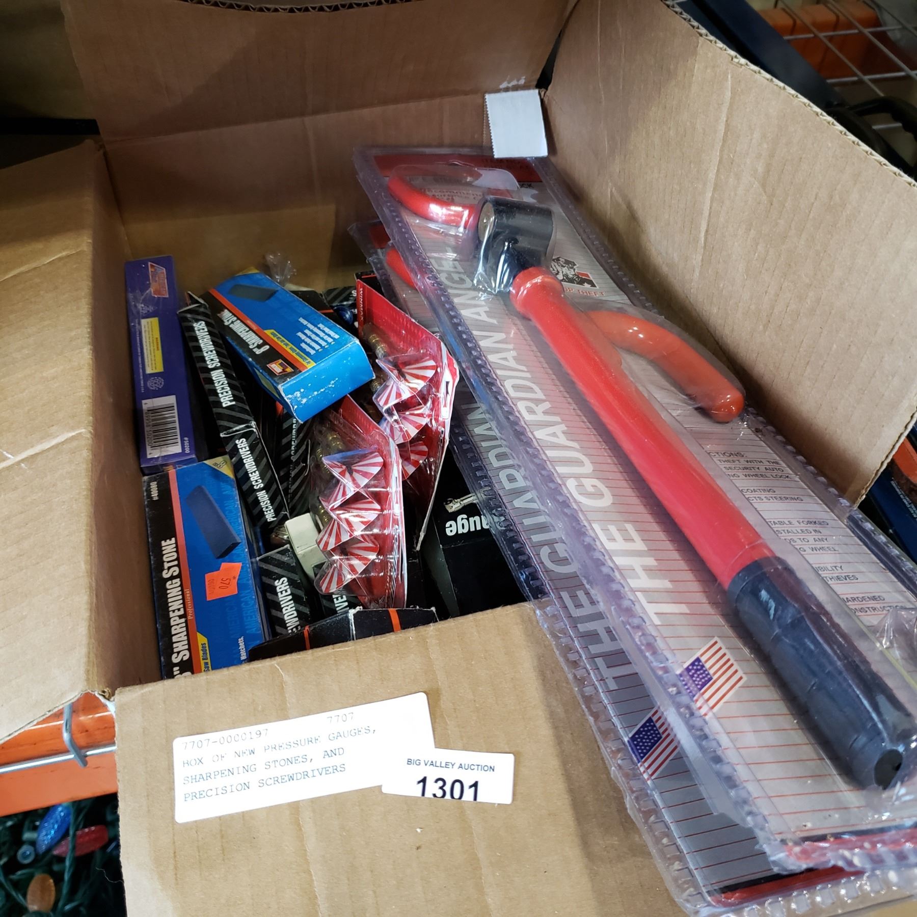 BOX OF NEW PRESSURE GAUGES, SHARPENING STONES, AND PRECISION SCREWDRIVERS