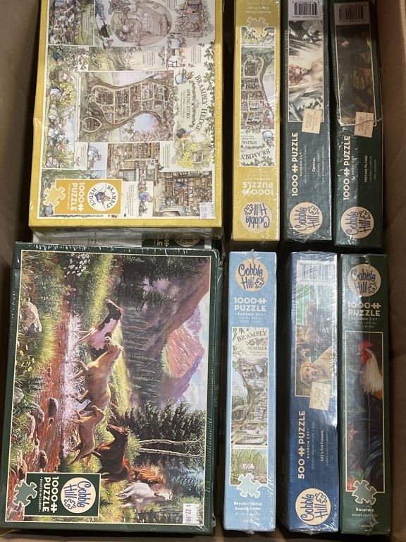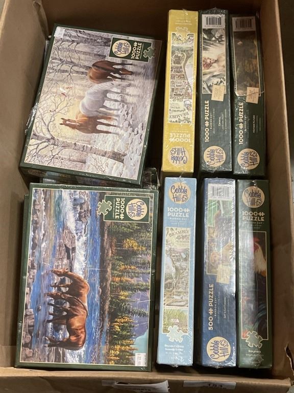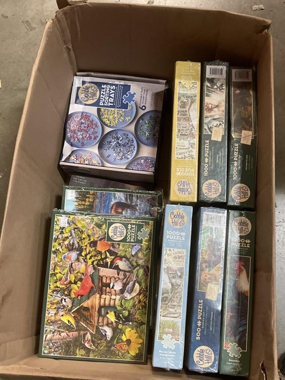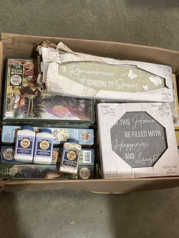 BOX OF NEW PUZZLES AND GLUE WITH HOME DECOR SIGNS