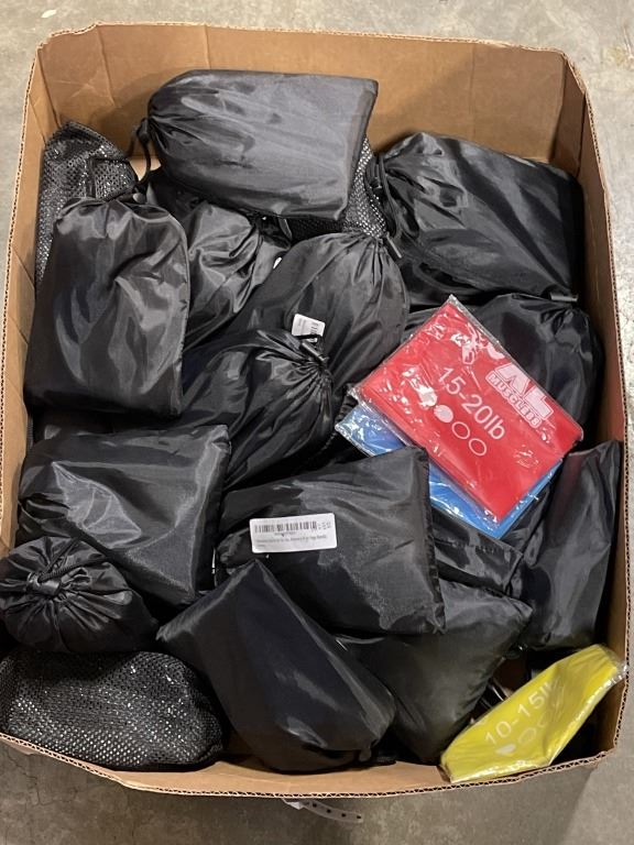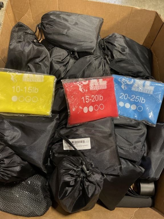 BOX OF NEW RESISTANCE BANDS AND EXERCISE ACCESSORIES