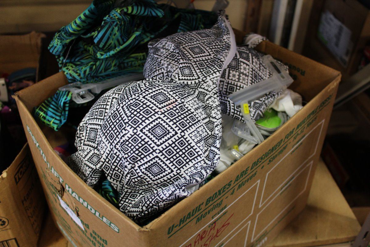 BOX OF NEW RETURNED BATHING SUITS SOCKS UNDERWEAR ETC