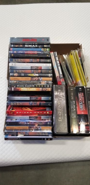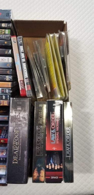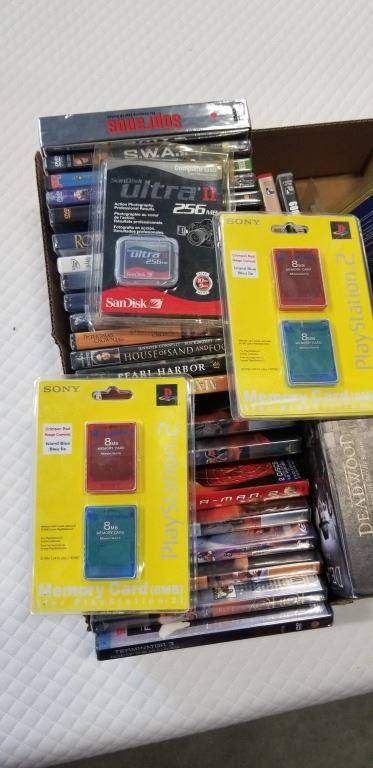 BOX OF NEW/SEALED DVDS, PS2 MEMORY CARDS, ETC