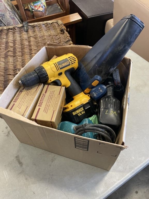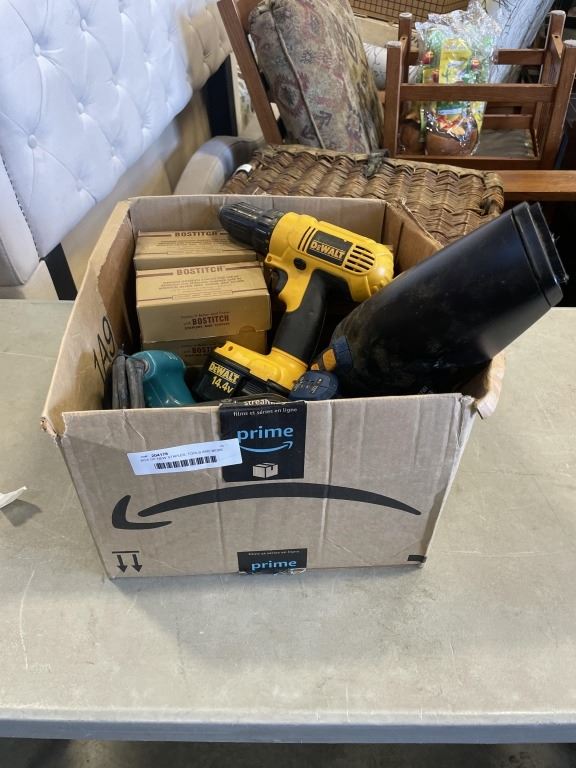 BOX OF NEW STAPLES, TOOLS AND MORE