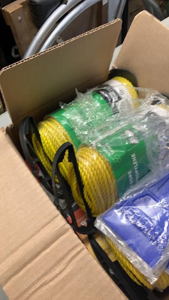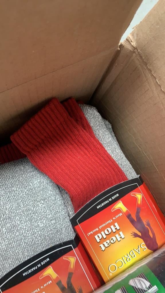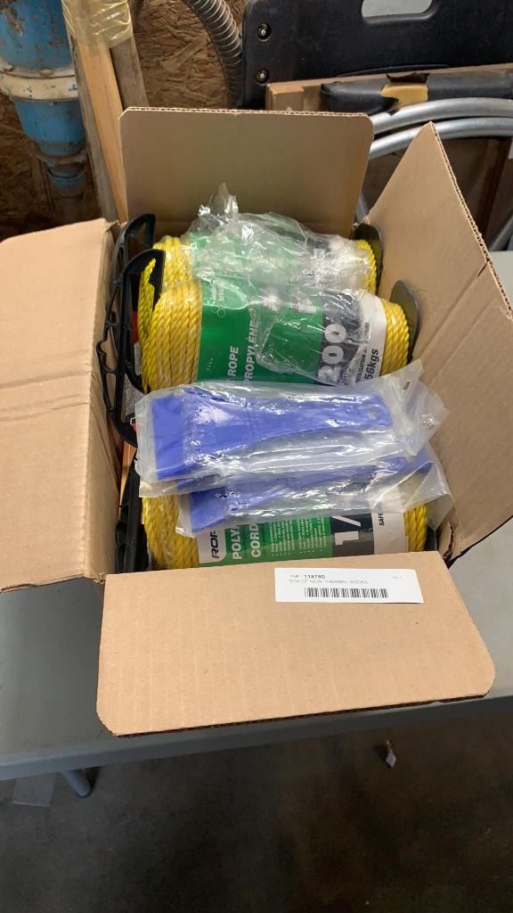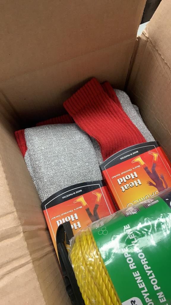 BOX OF NEW THERMAL SOCKS, PROPYLENE ROPE AND ICE SCRAPERS