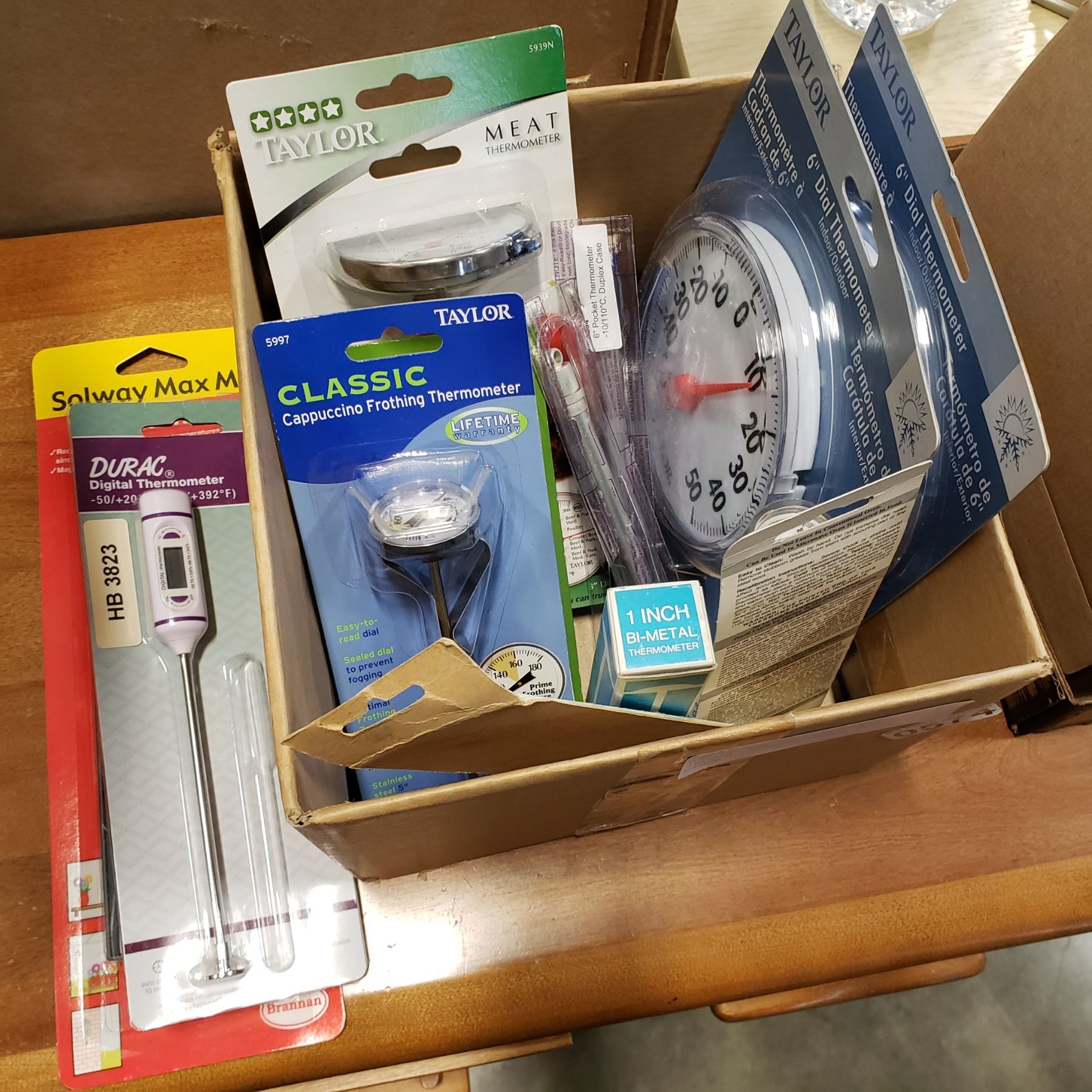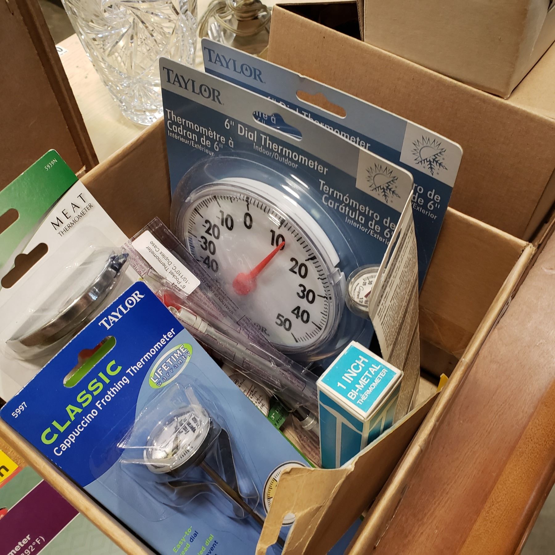 BOX OF NEW THERMOMETERS INDOOR/OUTDOOR, MEAT, AND OTHER