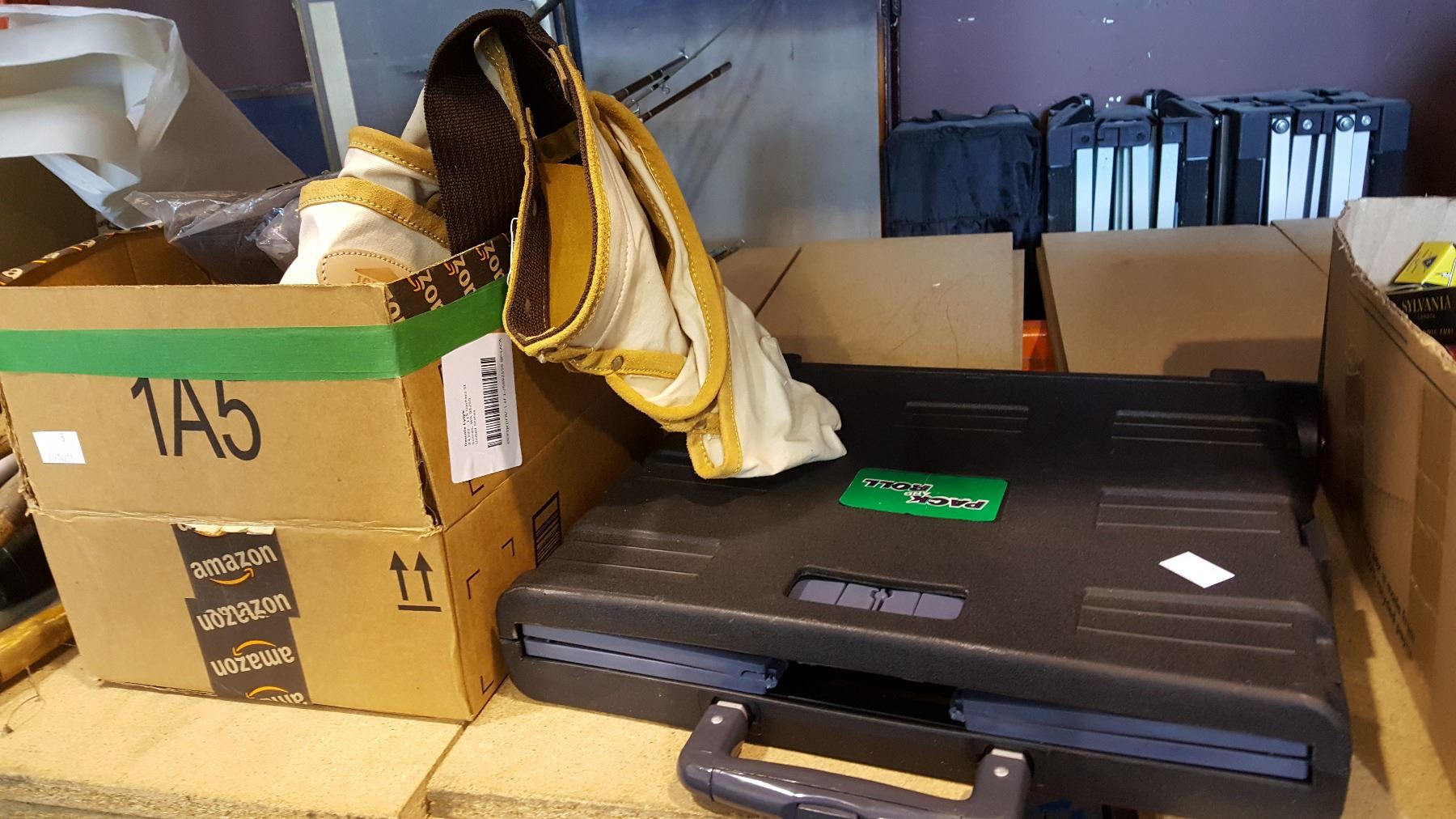 BOX OF NEW TOOL AND ROLLING FOLDING CART