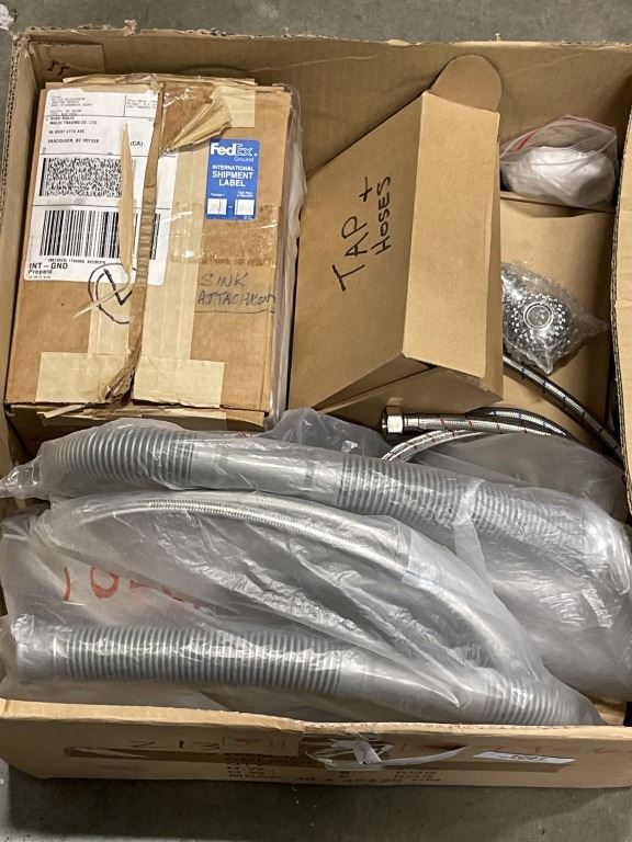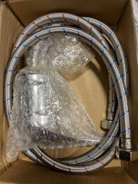 BOX OF NEW WATER SHUT OFF VALVES BRAIDED HOSES AND MORE