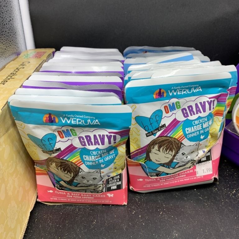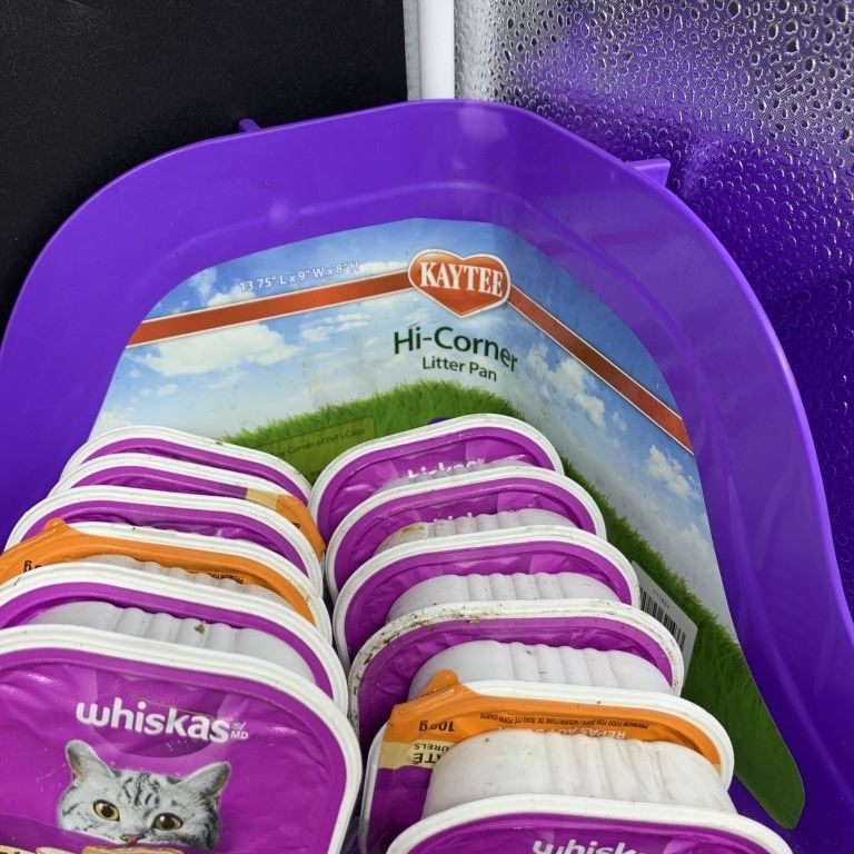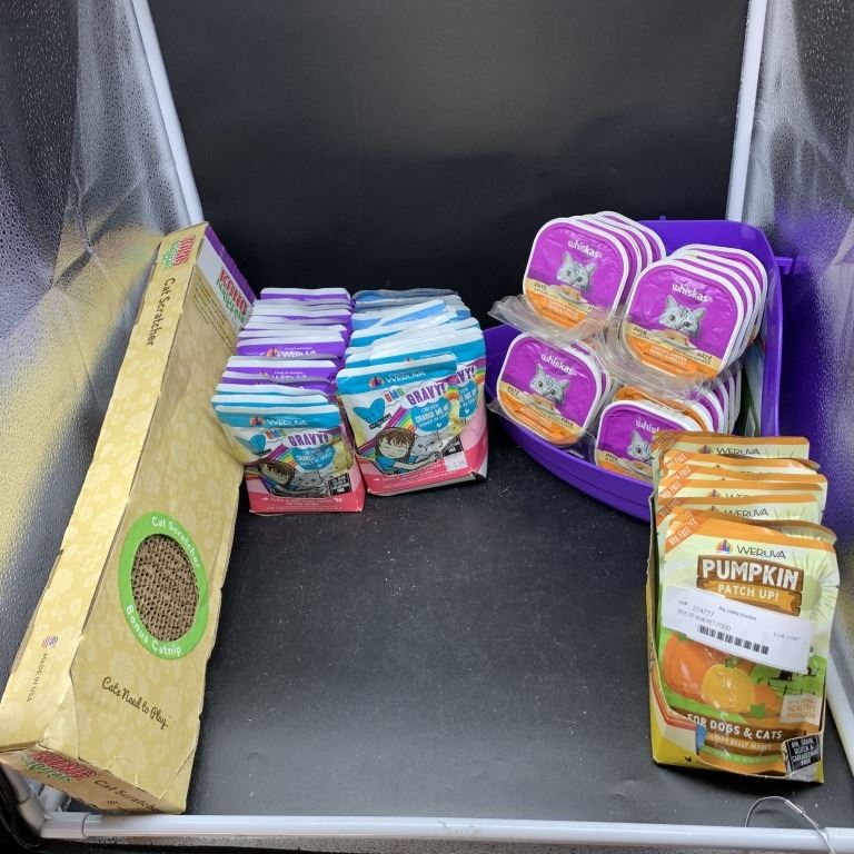 BOX OF NEW WHISKAS PATE, CAT SCRATCHER, CAT GRAVY AND CORNER LITTER TRAY