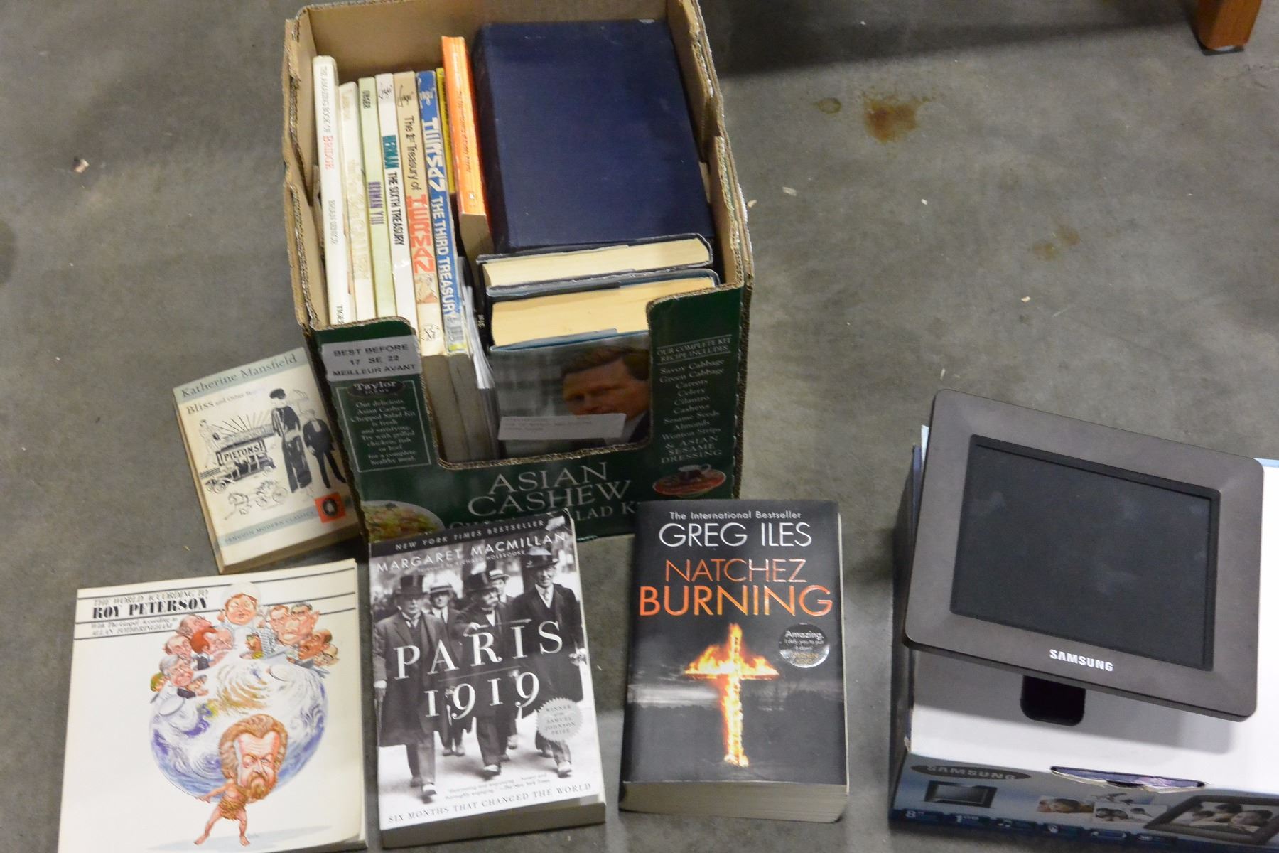 BOX OF NOVELS AND DIGITAL PHOTO ALBUM