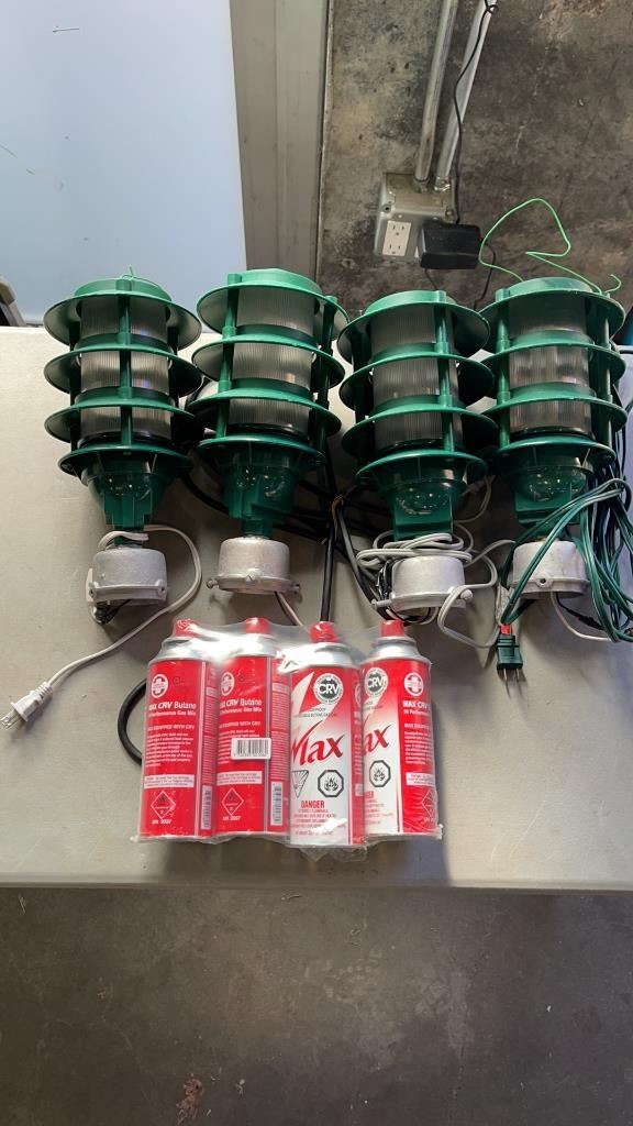 BOX OF OUTDOOR LIGHTS AND BUTANE CANNISTERS