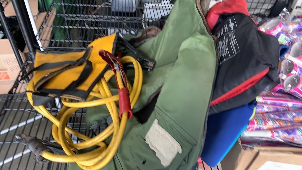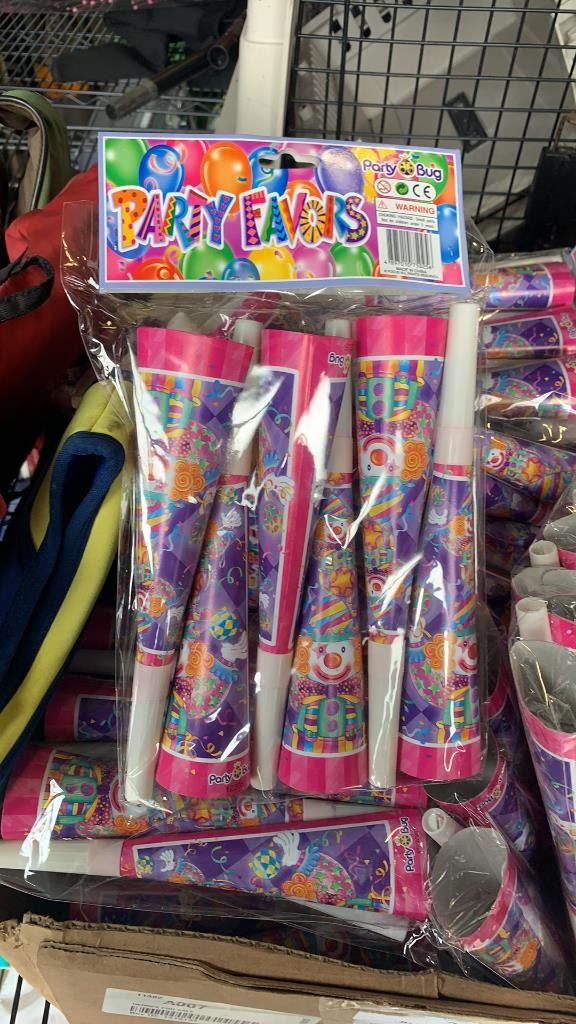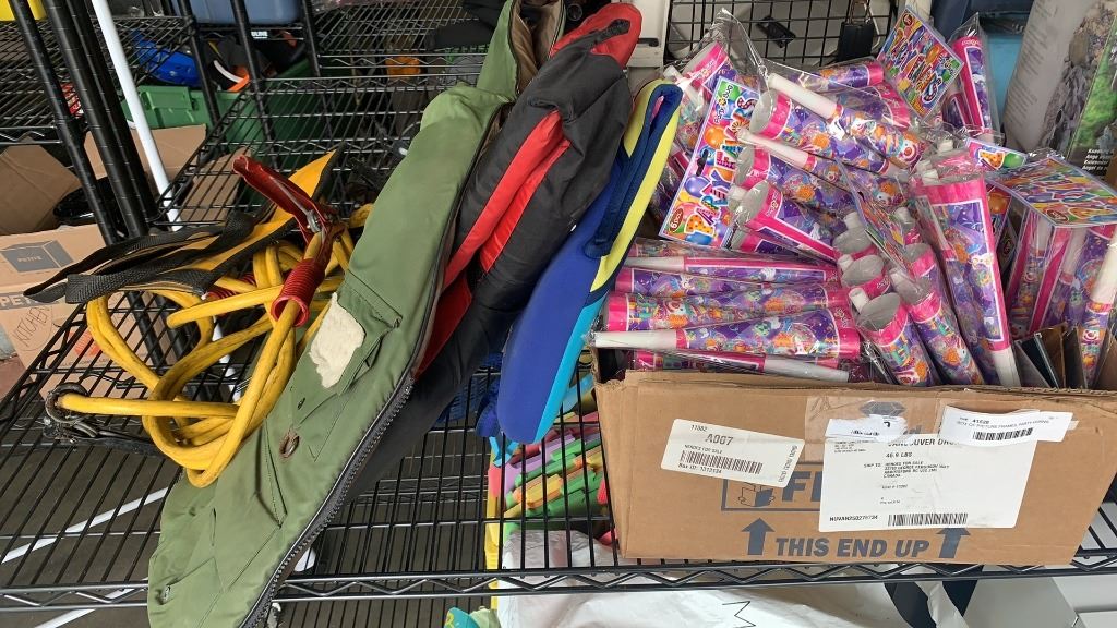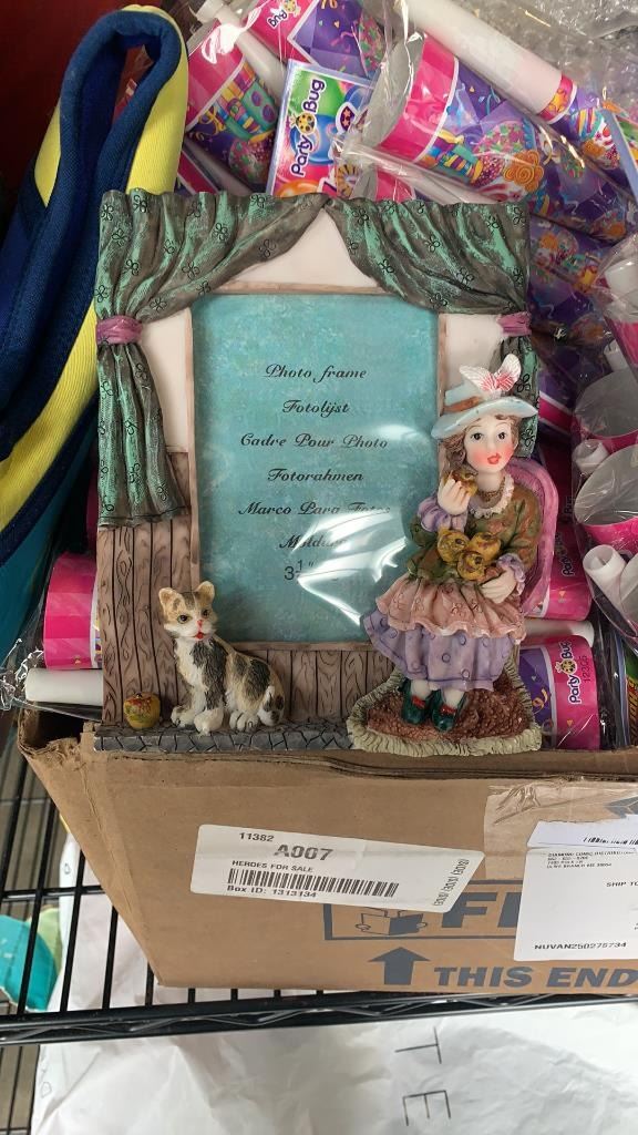 BOX OF PICTURE FRAMES, PARTY HORNS AND LIFE JACKETS