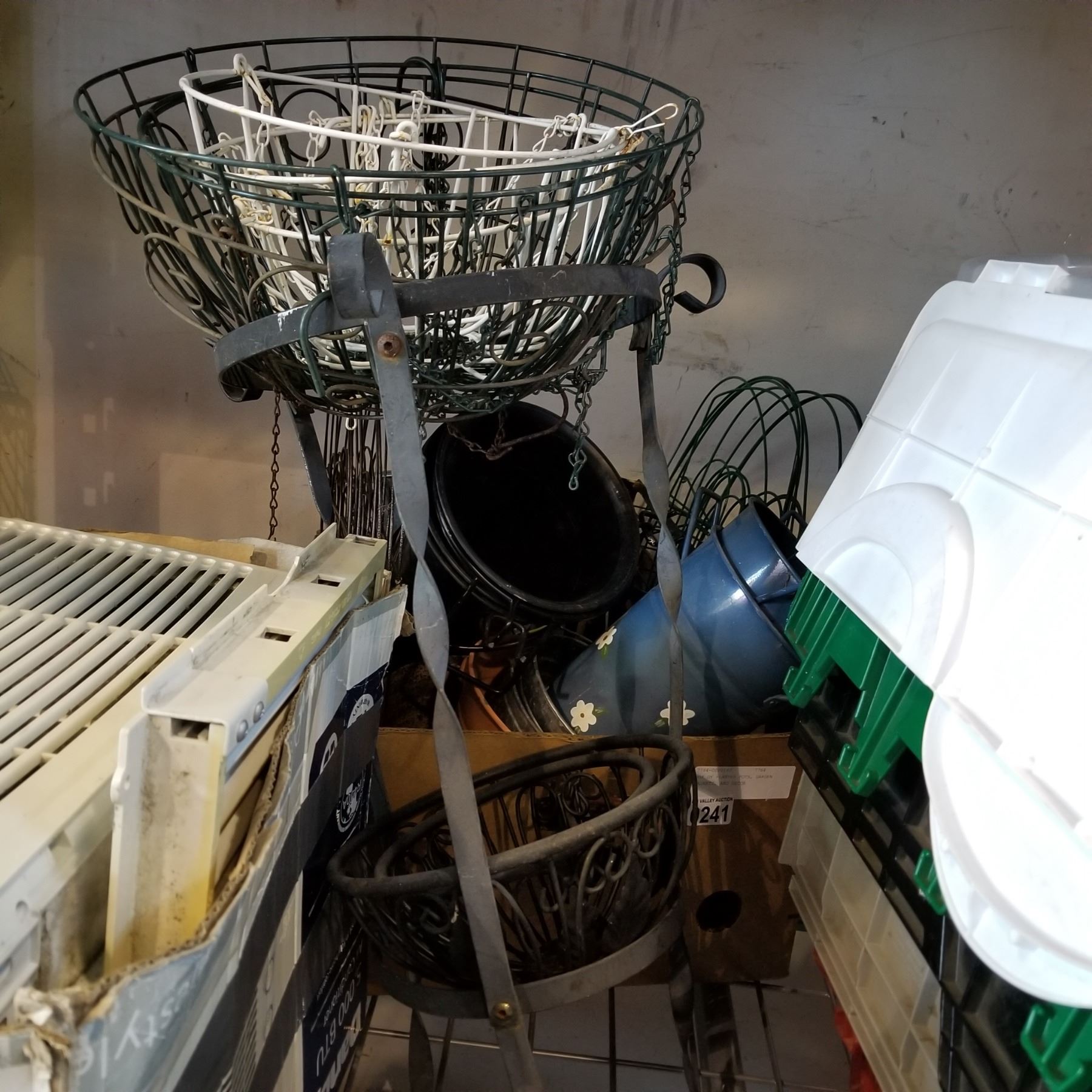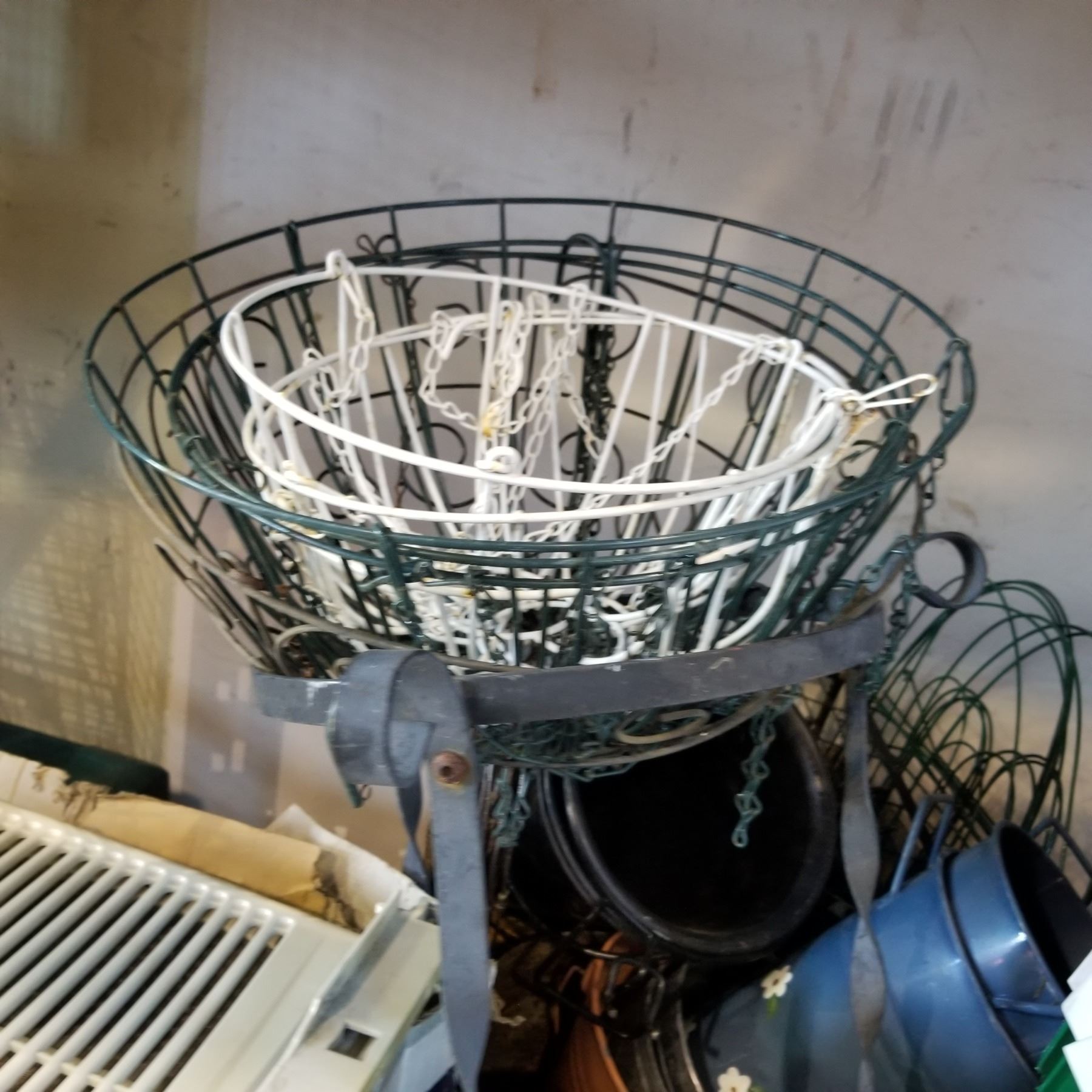 BOX OF PLANTER POTS, GARDEN BASKETS, AND DECOR