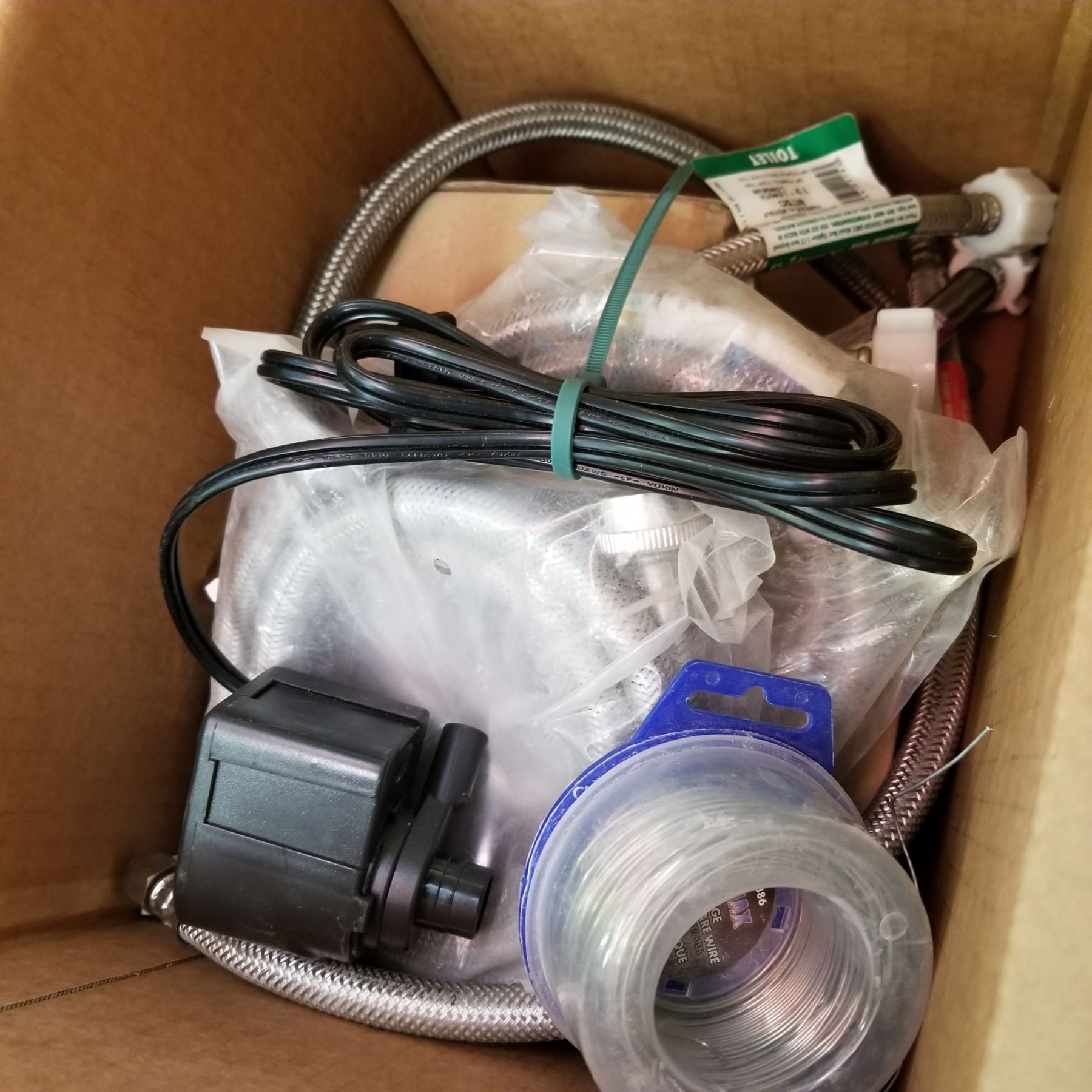 BOX OF PLUMBING SUPPLIES, DRAIN, AND BRAIDED HOSE