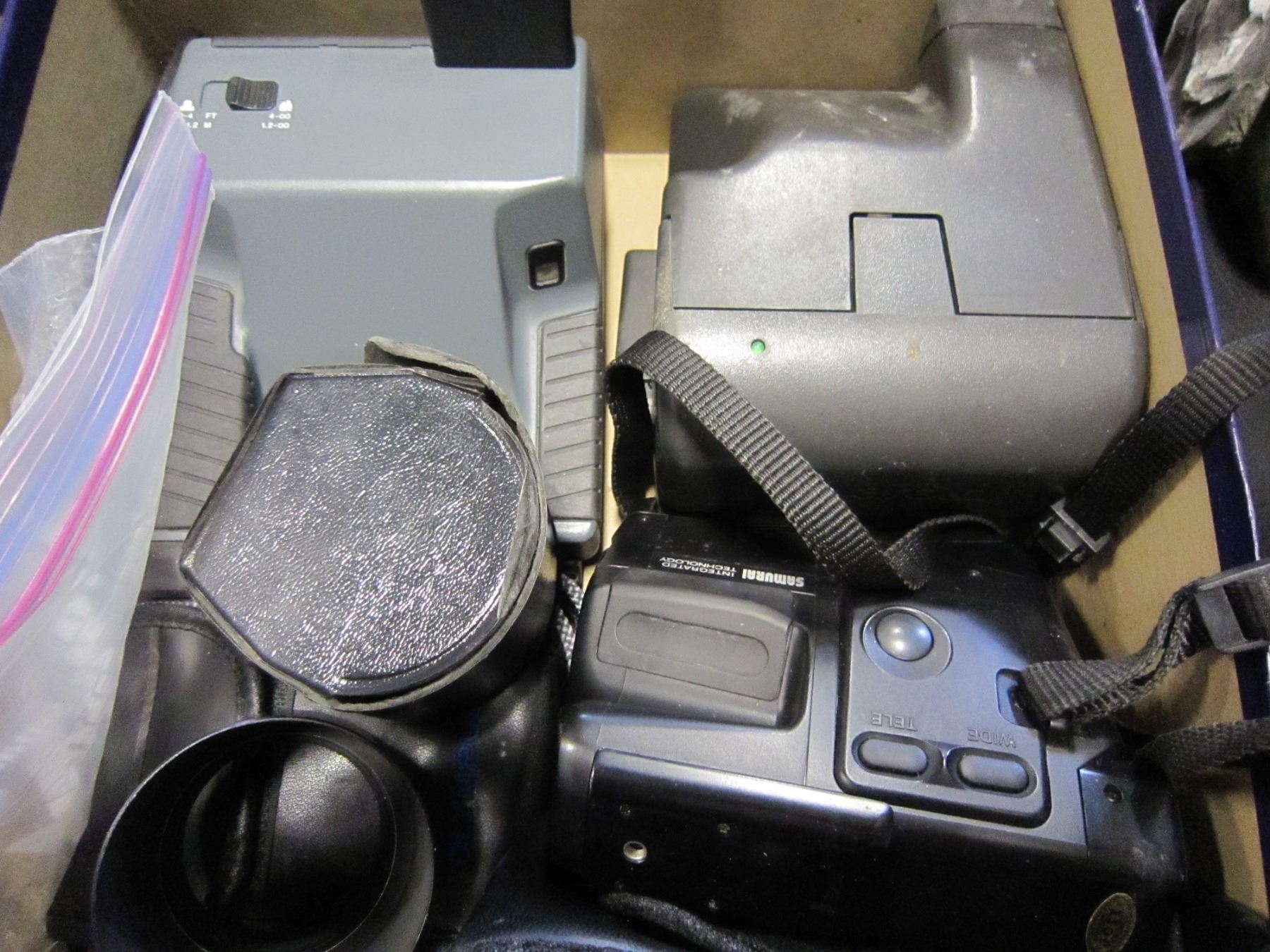 BOX OF POLARIOD, SAMURAI, AND CAMERA STRAPS