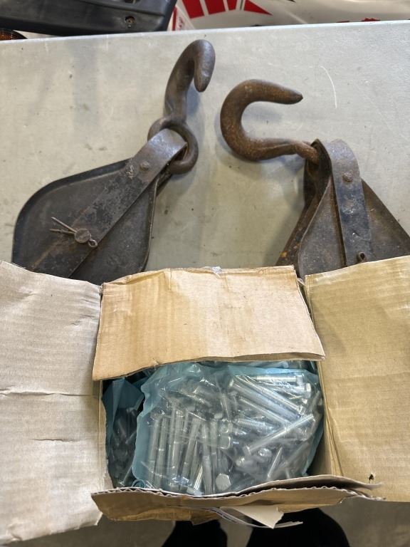BOX OF PRO FASTENERS HEX CAPSCREWS AND 2 HOOKS