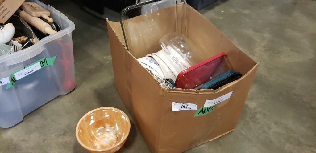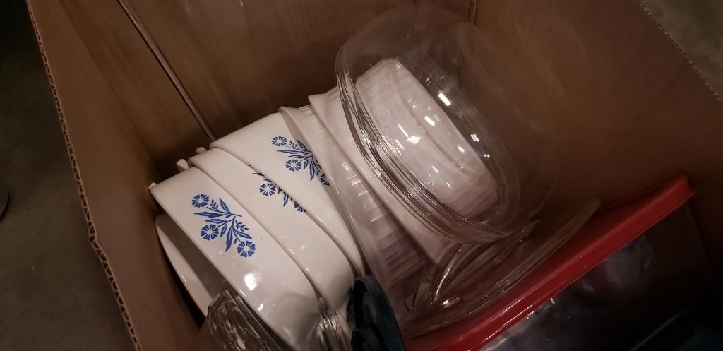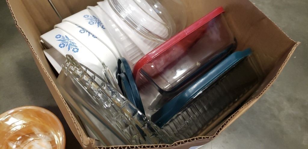 BOX OF PYREX, CORNING, AND FIRE KING DISHES