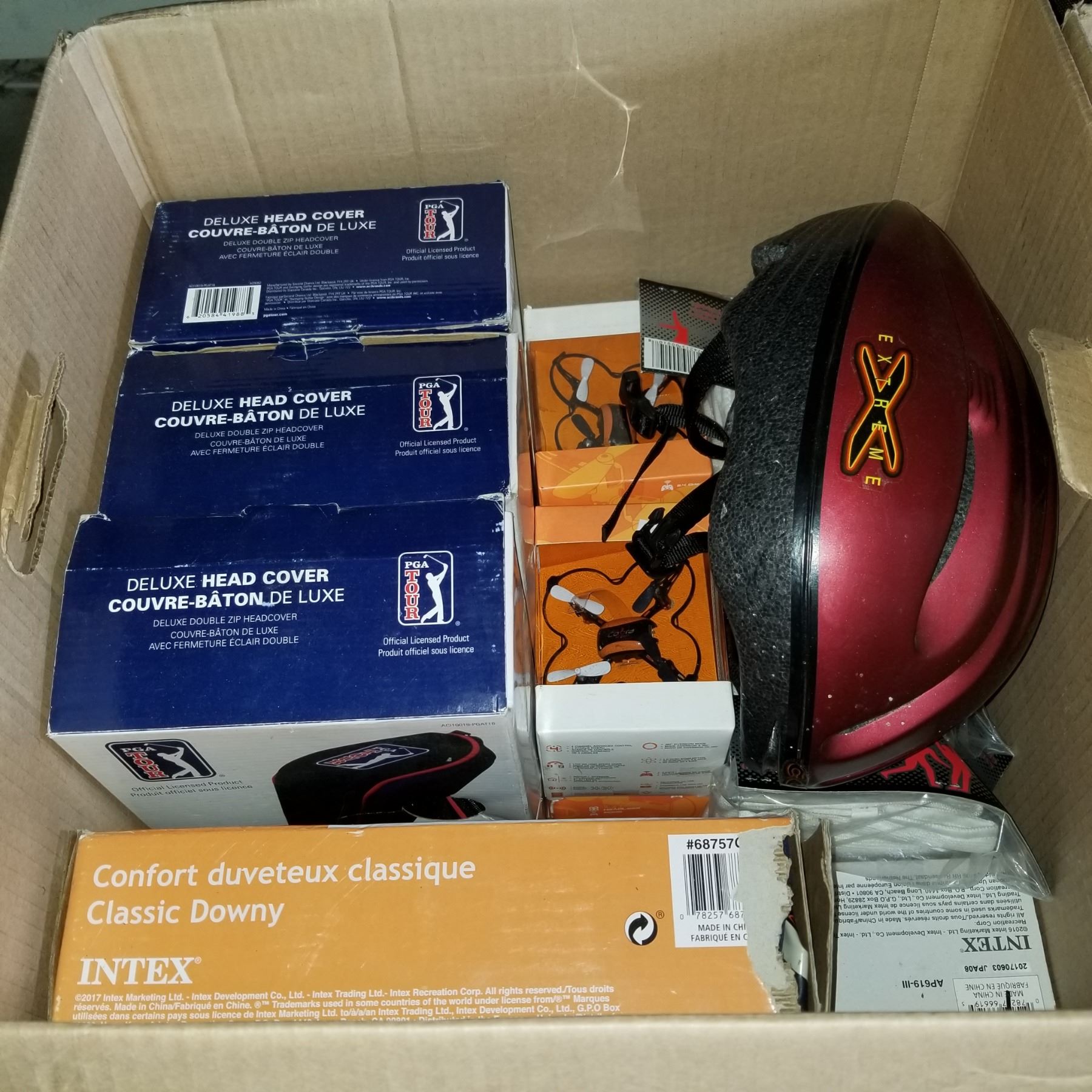 BOX OF RC DRONES GOLF HEAD COVERS AND ESTATE GOODS