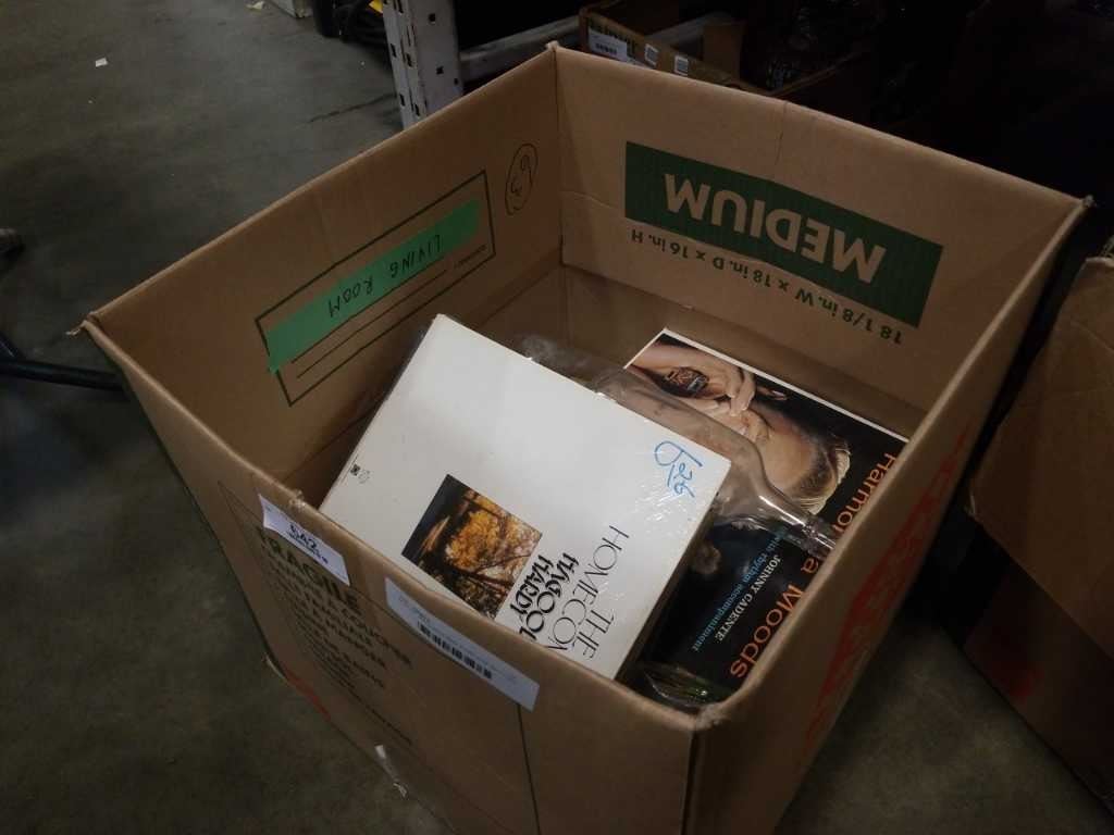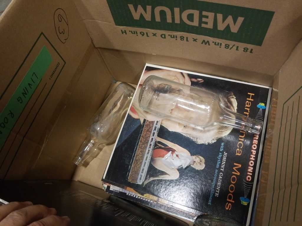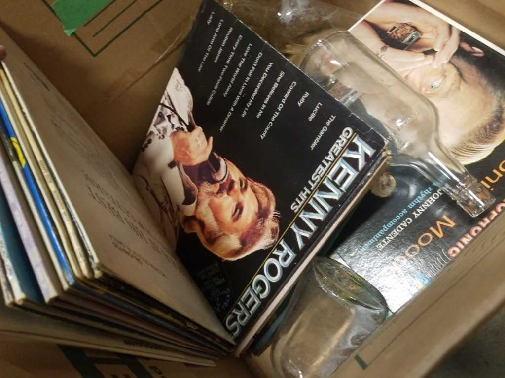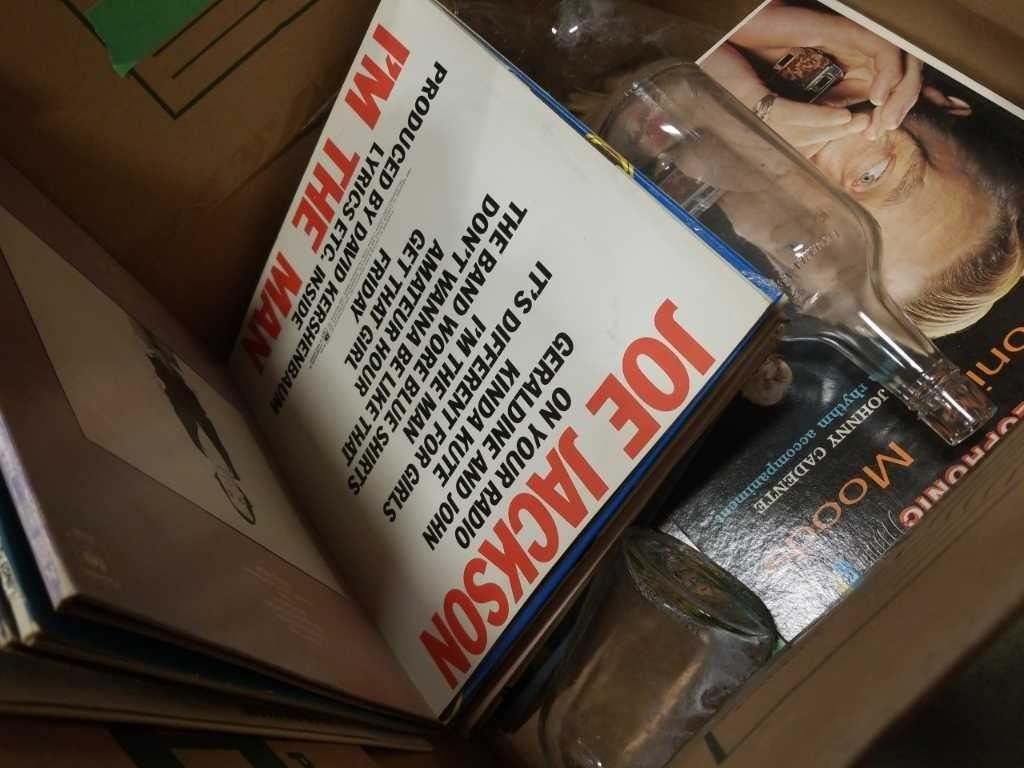 BOX OF RECORDS AND 3 VINTAGE BOTTLES