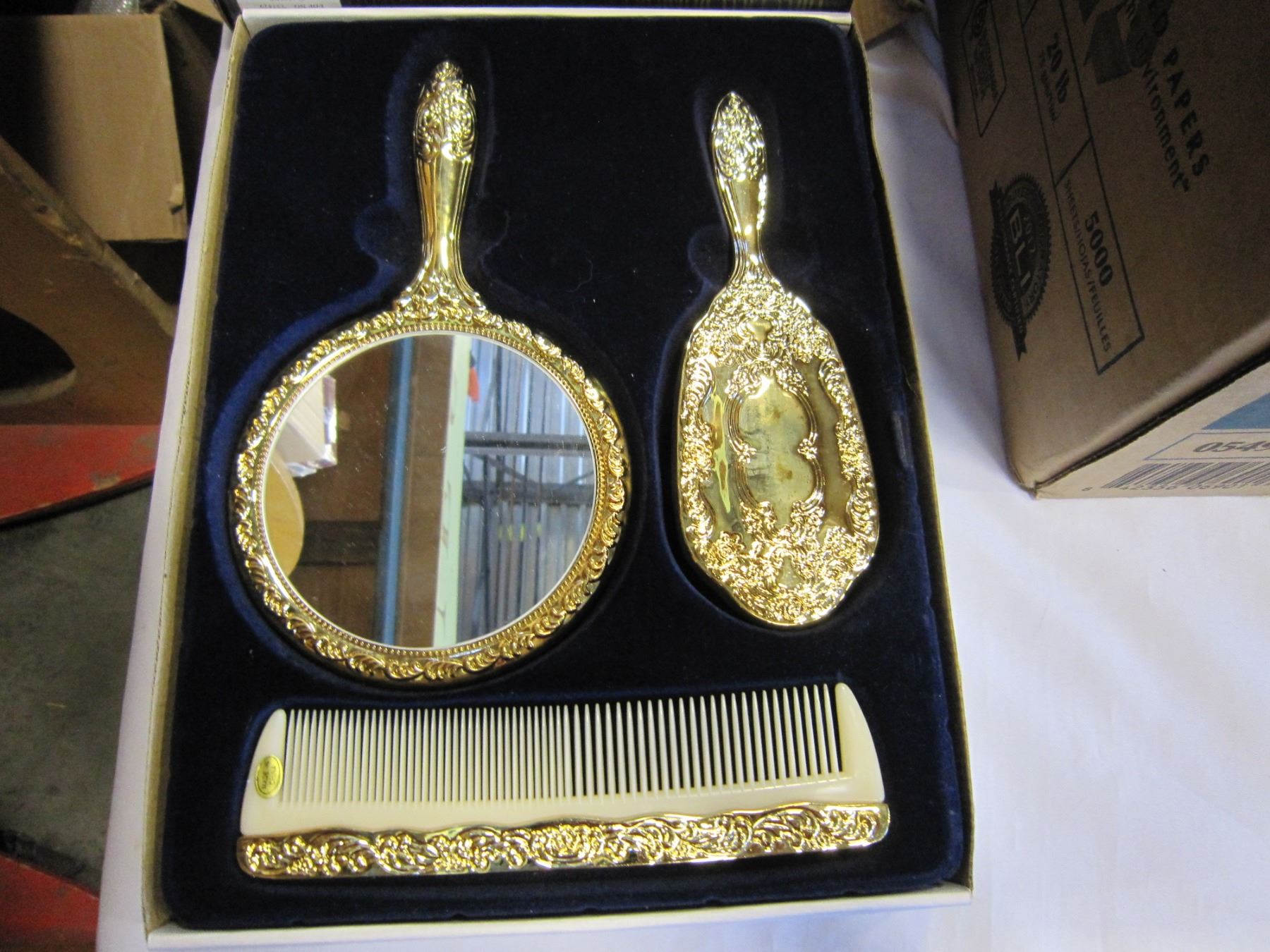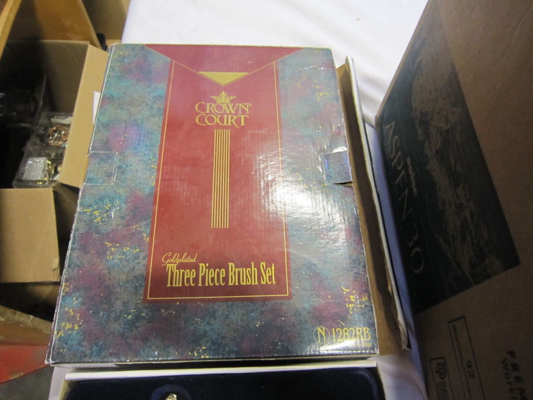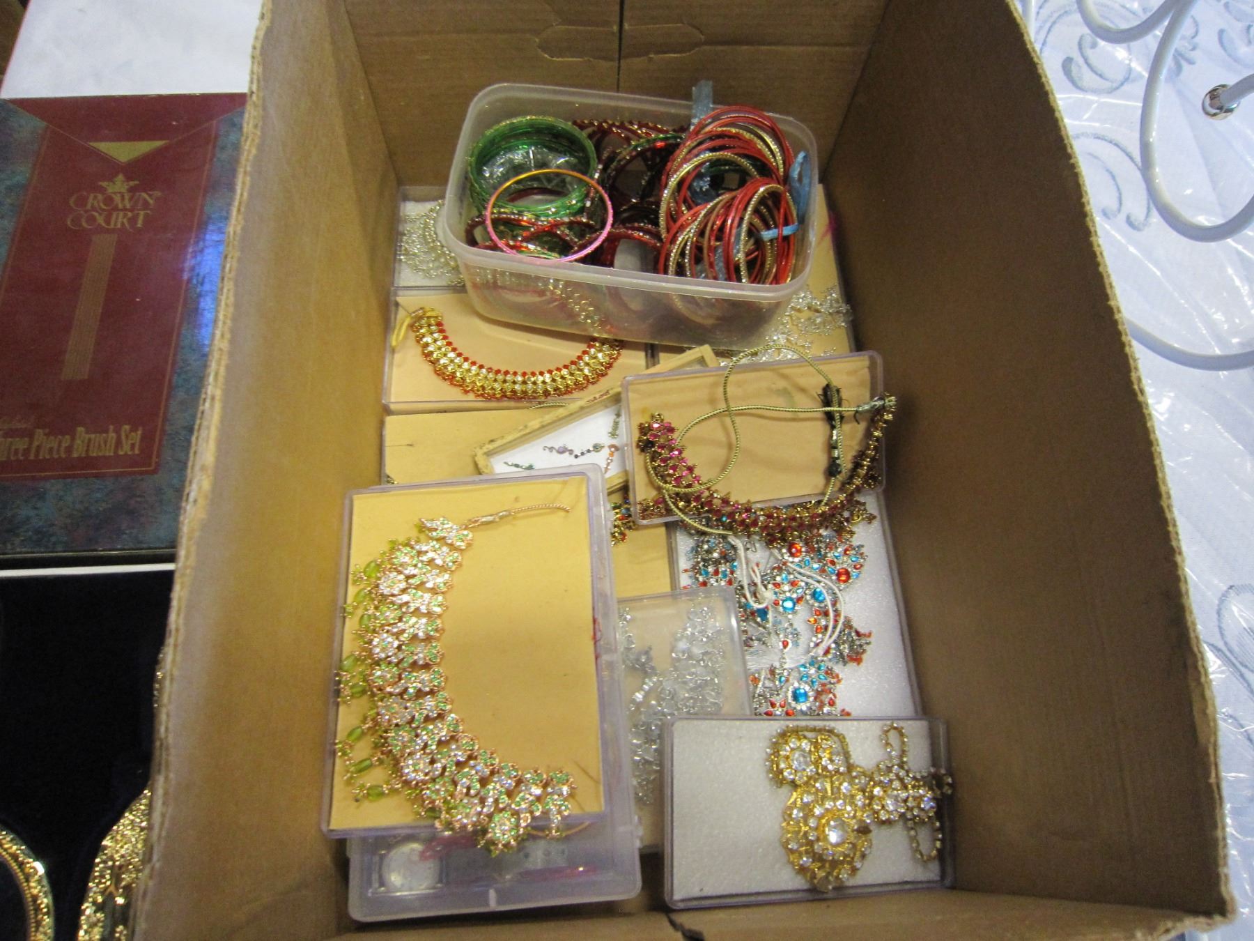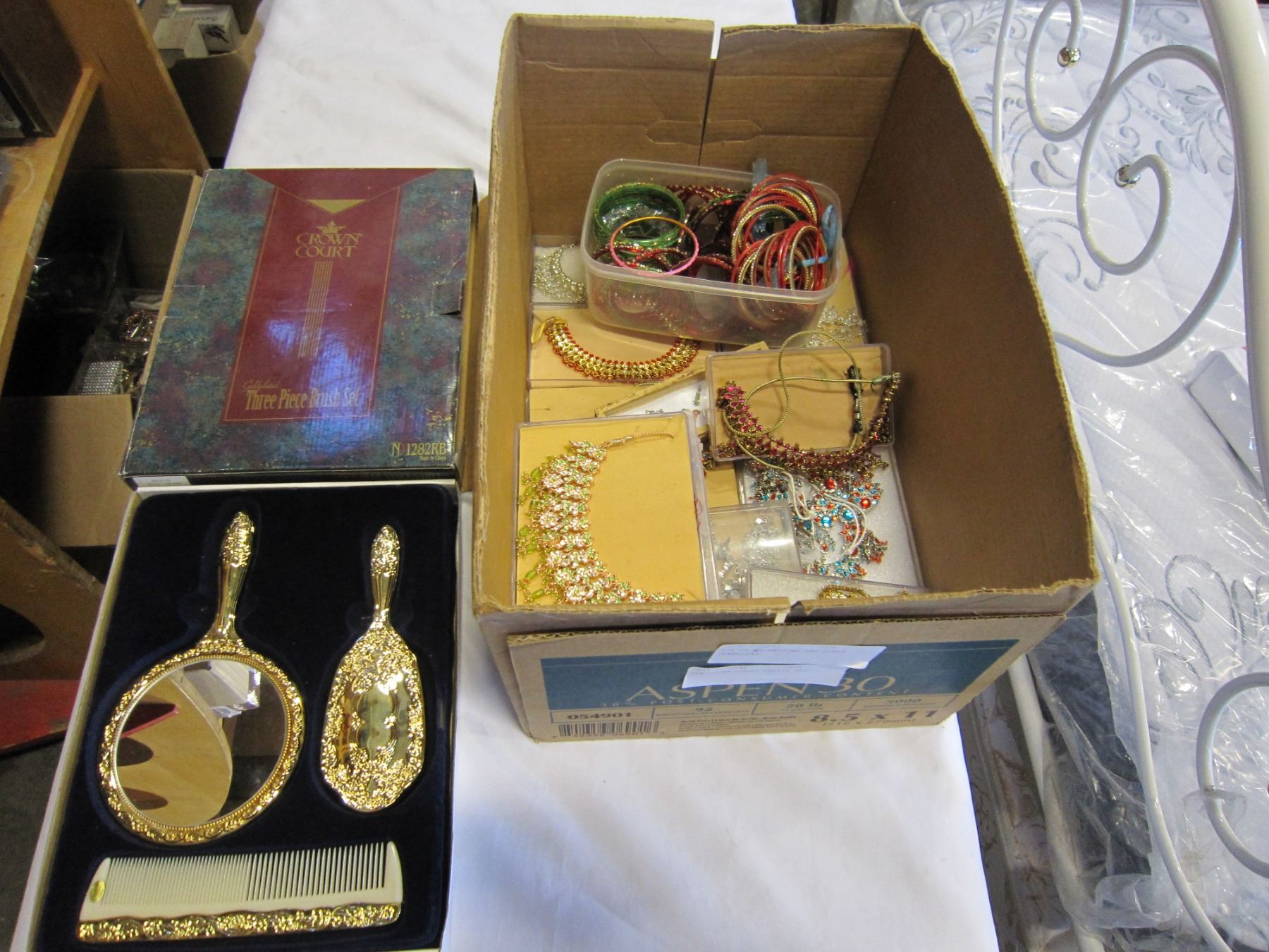 BOX OF RHINESTONE AND OTHER JEWELLERY AND NEW CROWN COURT VANITY SET